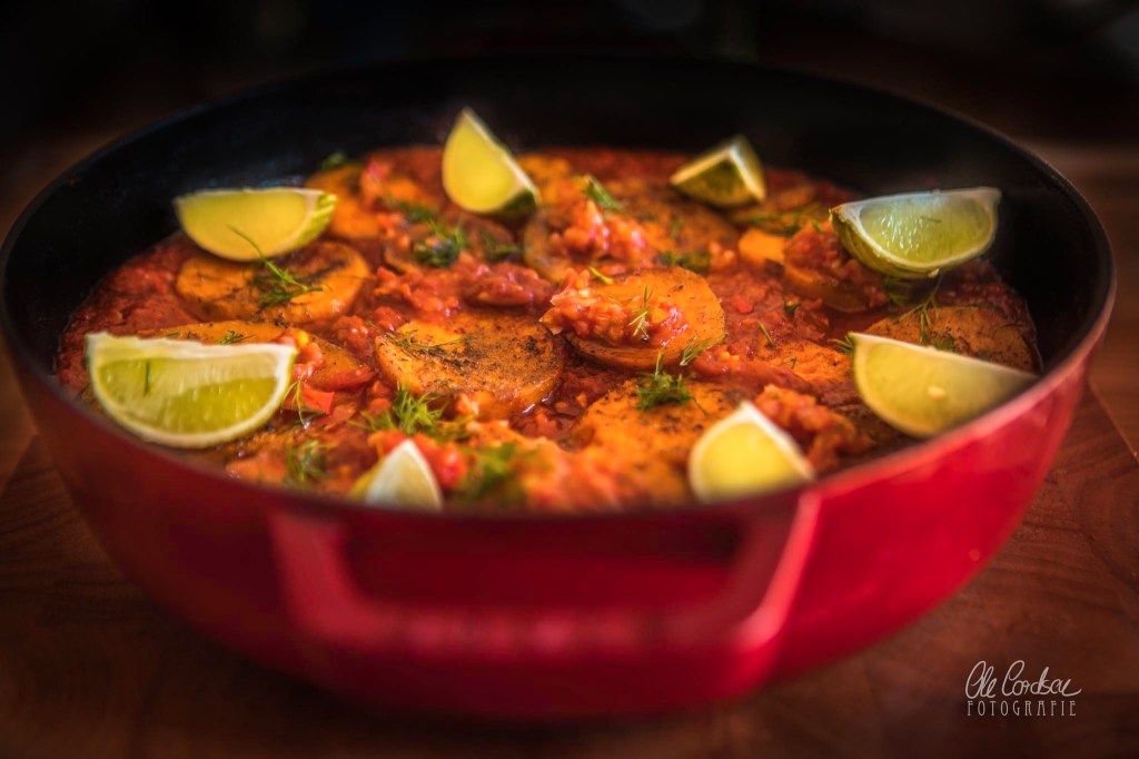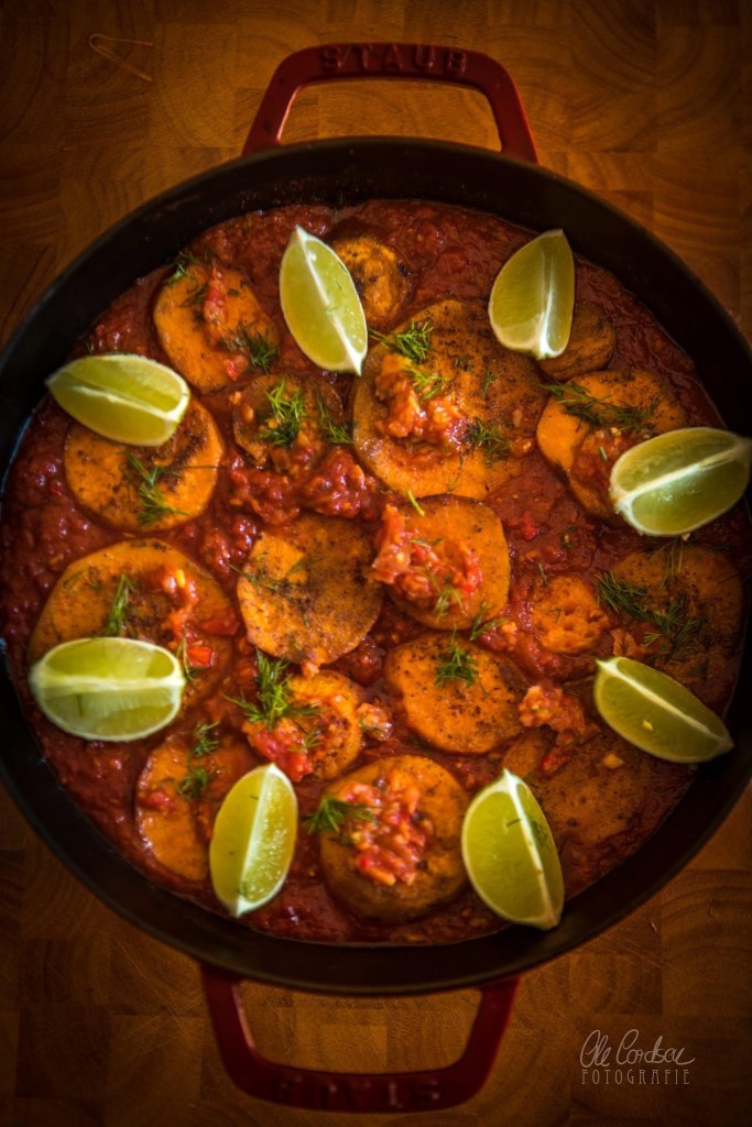 Karamellisierte Ofen-Süßkartoffeln in einer Tomaten-Kardamom-Limetten-Sauce.