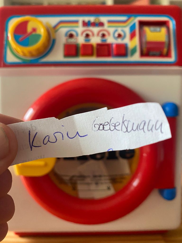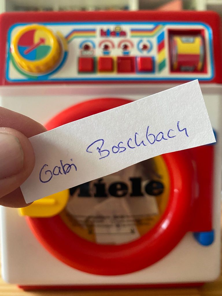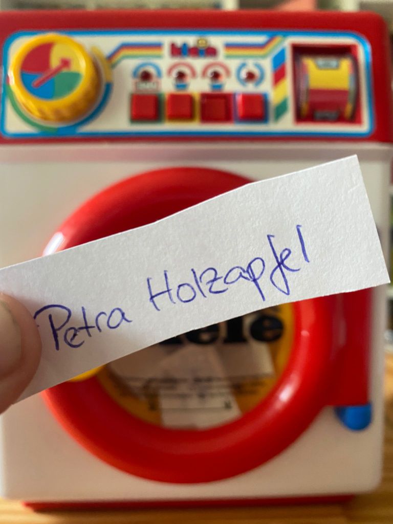 Um es fair zu machen, habe ich mir eine kleine Spielzeug-Waschmaschine als Lostrommel ausgeborgt. Alle, die sich beteiligt haben, namentlich feinsäuberlich auf Papier gekritzelt, ausgeschnitten, gefaltet, in die Trommel gesteckt und sie kräftig drehen lassen. Wie das ausgesehen hat, habe ich auch gefilmt, wobei ich zu blöd war, gleichzeitig zu filmen und zu ziehen, daher habe ich zumindest vom ersten Durchmischen ein kleines Video gedreht, das Ihr hier sehen könnt (WordPress erlaubt eigene Uploads nur, wenn man ein weiteres kostenpflichtiges Update bucht).
