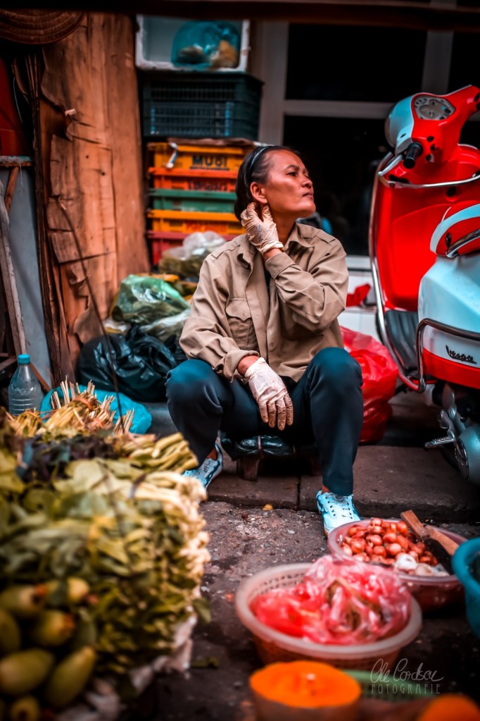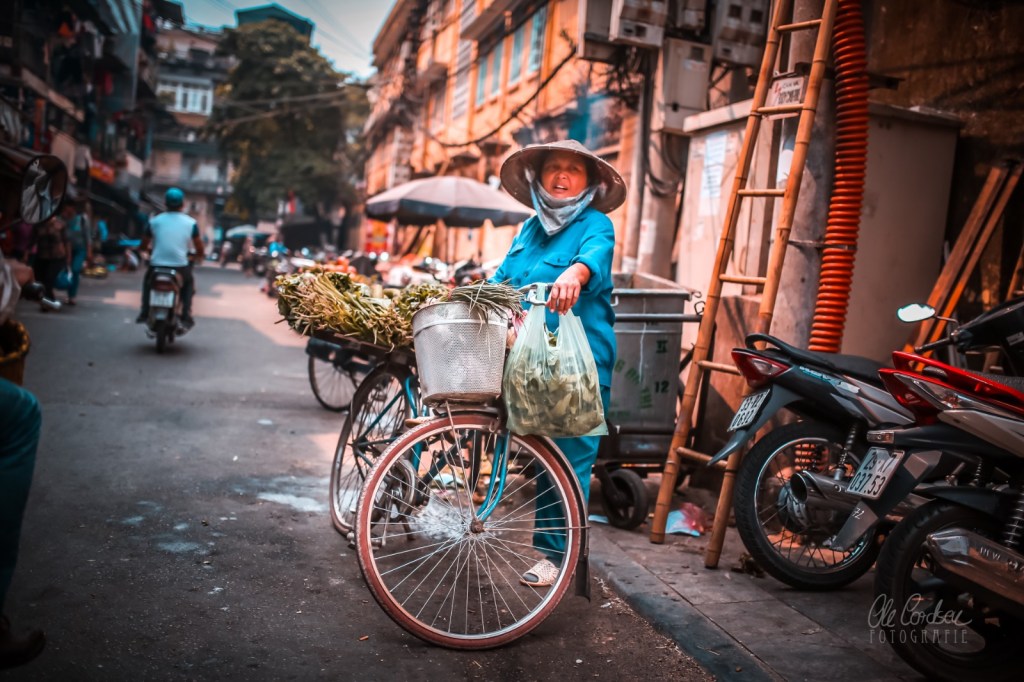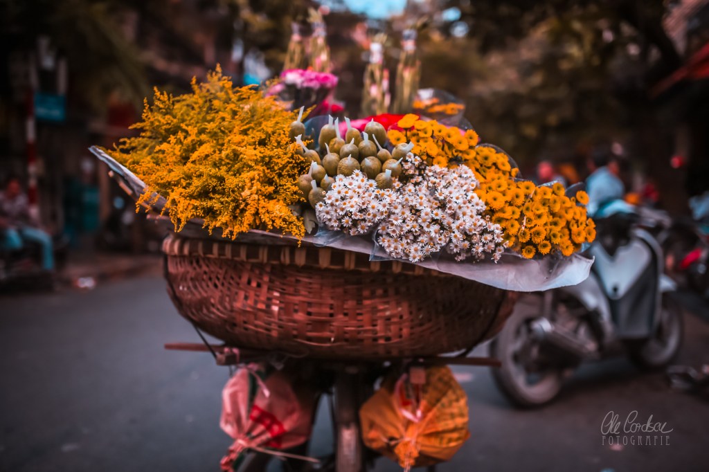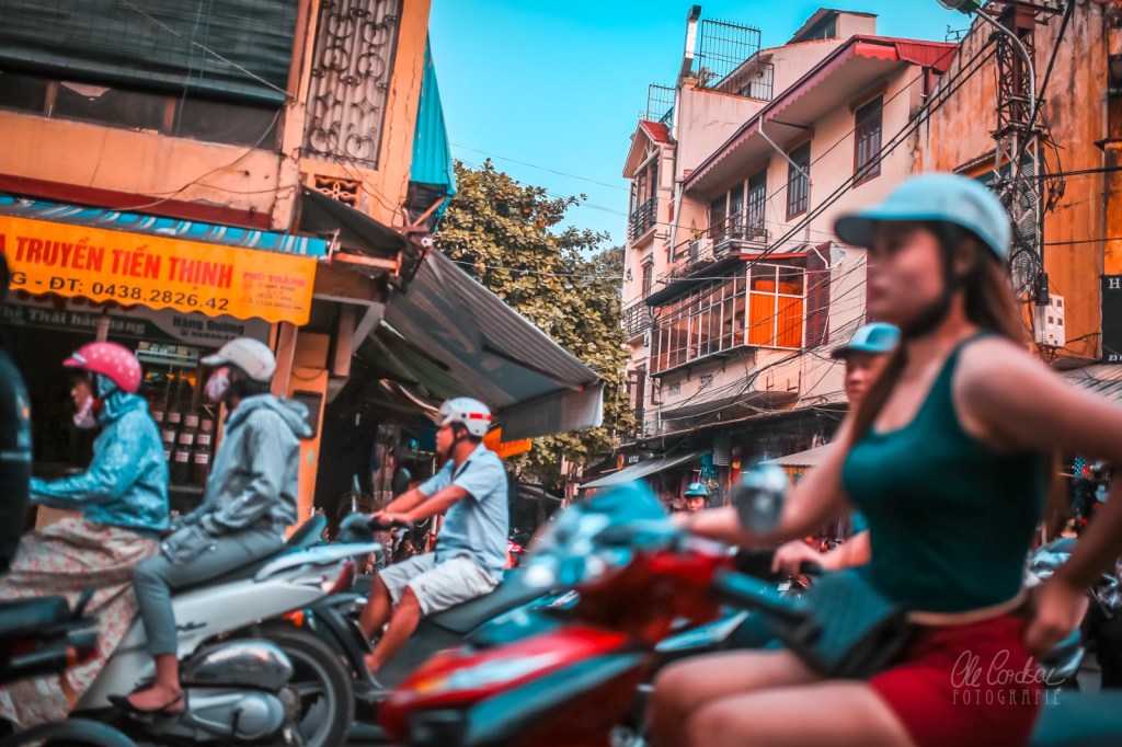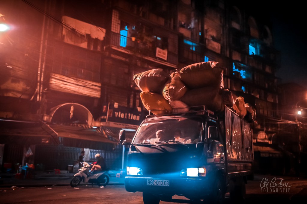 Familien klauben ihre Bettdecken vom Fußboden im kleinen Geschäftsraum, in dem sie gerade noch geschlafen haben, lassen die Rollos vor ihren Geschäften hochrattern, wischen sich die letzten Schlafkrümel aus den Augenwinkeln – und begrüßen den Tag und die ersten Kunden. Die ersten Mopeds sausen heran, teils meterhoch schwanken Pappkartons auf den Gepäckträgern. Andere sind ebenso üppig beladen mit Reissäcken, Ziegelsteinpacken, Gummitieren, Heuballen, Wasserkanistern, Blechkochtöpfen, Klopapier, Kanalrohren, Nähgarnrollen, ein gefühltes Fuder. Spanngurte ächzen und geben ihr Bestes. Rikscha-Fahrer haben die Samt-Baldachine ihrer Räder abgestaubt, wienern die Chrom-Streben und steigen auf, langsam tretend auf der Suche nach Kundschaft. Wohin man tritt, flattert der gelbe Stern auf rotem Grund, die Nationalflagge Vietnams im Wind und bauscht sich. Touristen, die von „Gangster-Nutten“ auf Motorrollern tiefnachts angequatscht und bedrängt worden sind und sich ihr Handy klauen lassen haben, beißen in Gedanken in imaginäre Tischplatten.