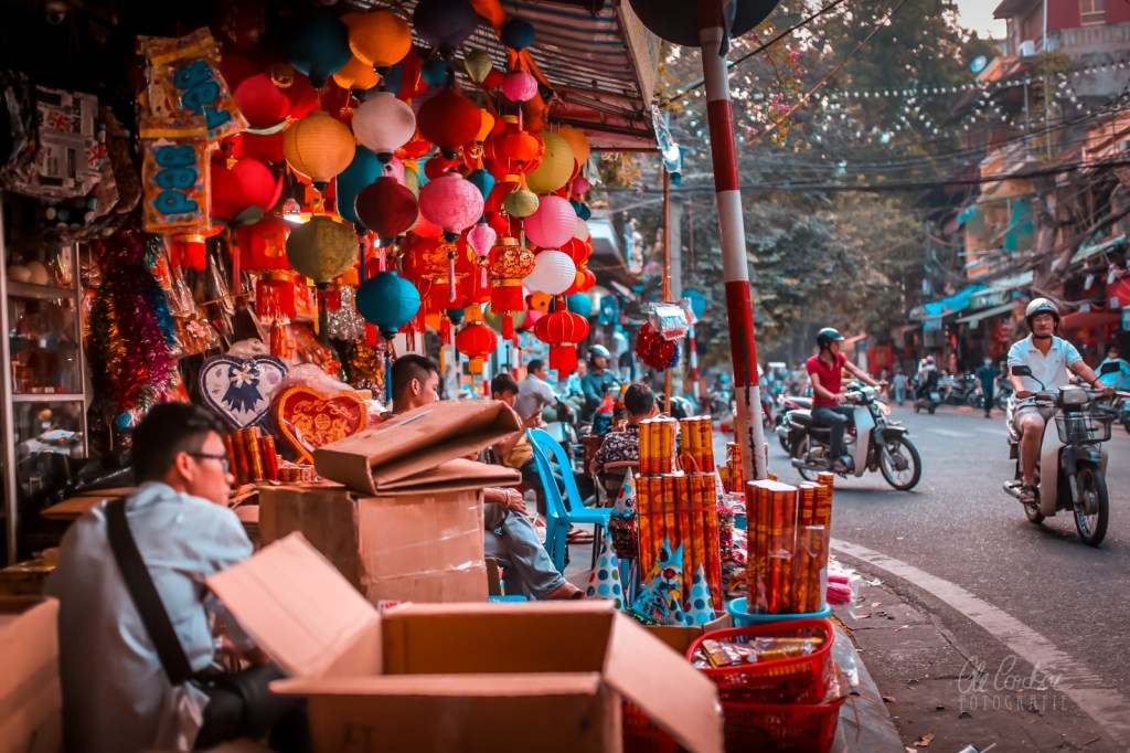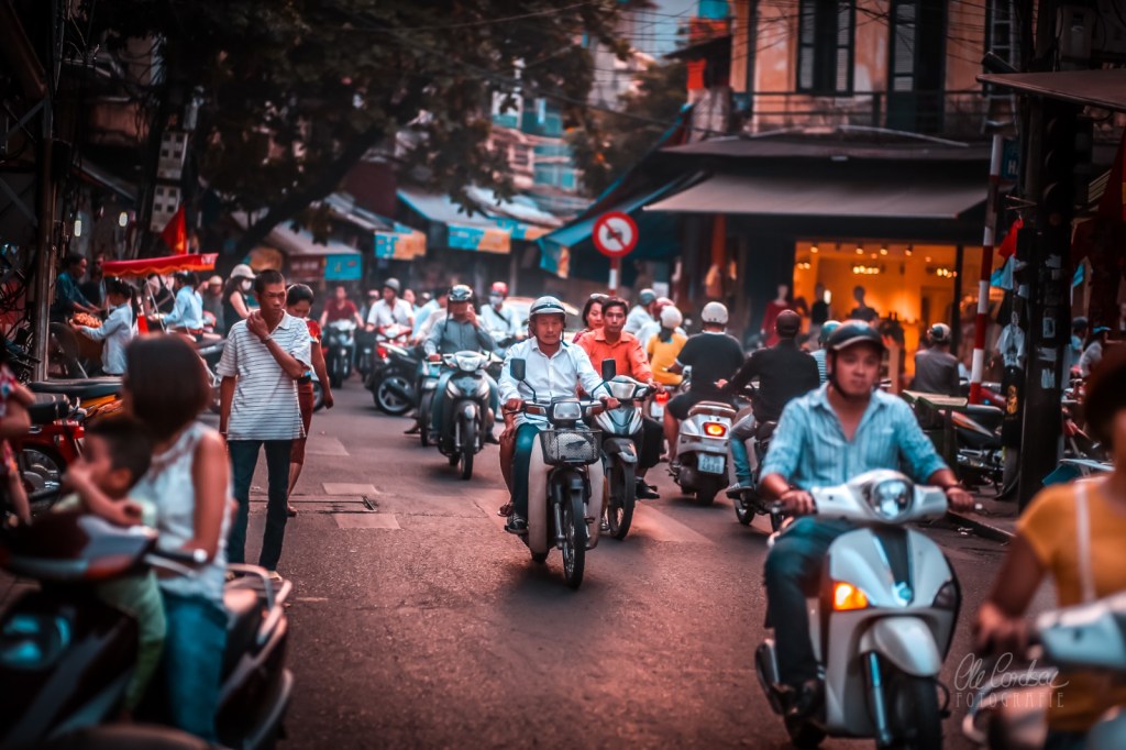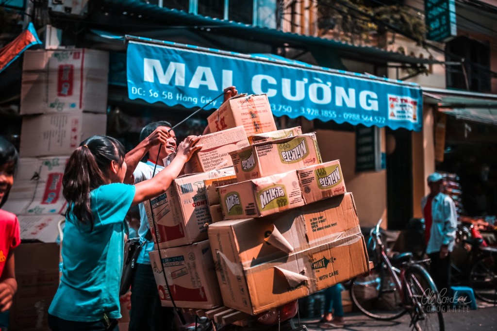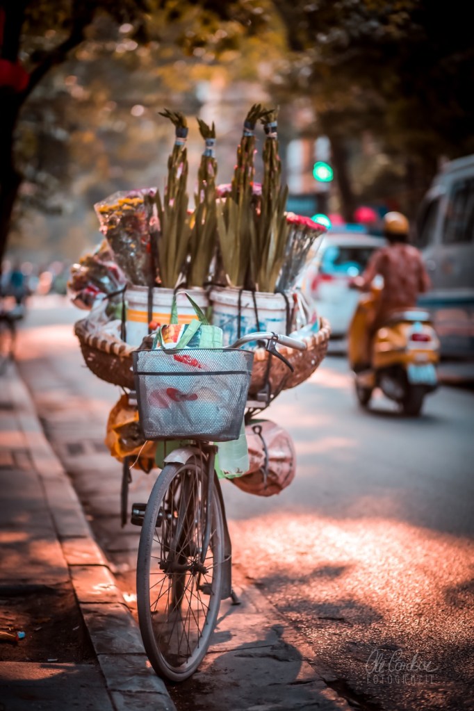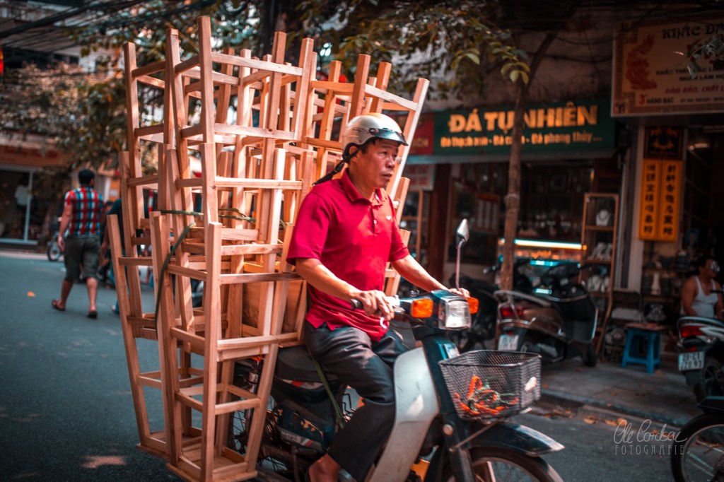 Familien klauben ihre Bettdecken vom Fußboden im kleinen Geschäftsraum, in dem sie gerade noch geschlafen haben, lassen die Rollos vor ihren Geschäften hochrattern, wischen sich die letzten Schlafkrümel aus den Augenwinkeln – und begrüßen den Tag und die ersten Kunden. Die ersten Mopeds sausen heran, teils meterhoch schwanken Pappkartons auf den Gepäckträgern. Andere sind ebenso üppig beladen mit Reissäcken, Ziegelsteinpacken, Gummitieren, Heuballen, Wasserkanistern, Blechkochtöpfen, Klopapier, Kanalrohren, Nähgarnrollen, ein gefühltes Fuder. Spanngurte ächzen und geben ihr Bestes. Rikscha-Fahrer haben die Samt-Baldachine ihrer Räder abgestaubt, wienern die Chrom-Streben und steigen auf, langsam tretend auf der Suche nach Kundschaft. Wohin man tritt, flattert der gelbe Stern auf rotem Grund, die Nationalflagge Vietnams im Wind und bauscht sich. Touristen, die von „Gangster-Nutten“ auf Motorrollern tiefnachts angequatscht und bedrängt worden sind und sich ihr Handy klauen lassen haben, beißen in Gedanken in imaginäre Tischplatten.