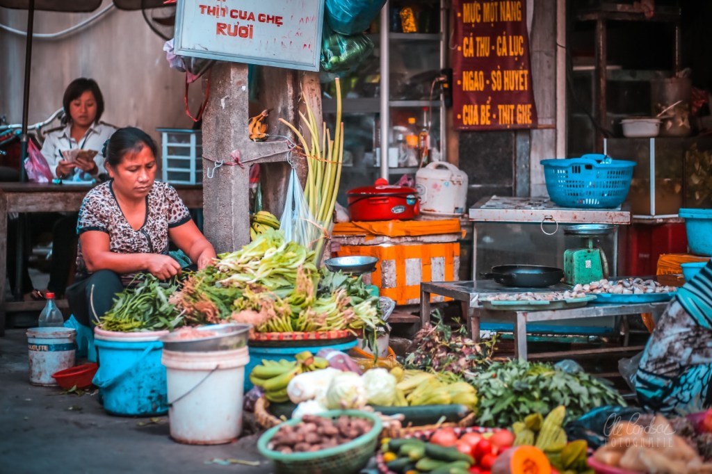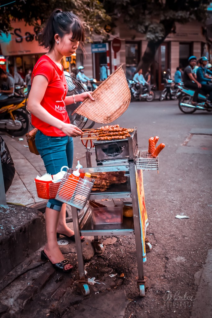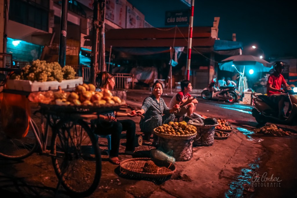 Der Lautsprecher-Weckruf ist die blechernd scheppernde Ouvertüre zum Brodeln der Tage in der Hauptstadt Vietnams – auch wenn die fliegenden Händlerinnen weit früher aufgestanden sind und noch im Nachtdunkel des Morgens – den typischen, Non genannten Strohhut auf dem Kopf – die unter ihren Tragejochen baumelnden Körbe oder Fahrräder mit Bananen und Mangos und Bananen und Cherimoyas, diesen seltsamen schuppigen Rahmäpfeln, beladen haben und sich an den Straßenrändern niederlassen oder durch die Gassen schieben. Auch Drachenfrüchte oder Weintrauben oder Mangostan-Früchte bieten sie feil. Rambutans recken ihre Stacheln zuhauf. Unter anderen Tragen baumeln Blechkochtöpfe und Kohlen, klappern Schöpfkellen und Messer. In den Pötten: Fleisch, Kräuter, knollige Ingwer-Rhizome, Gemüseschnitze, Spieße. Zutaten, mit denen die Straßenchefs den Morgen über offenem Feuer zerkochen. Vögel zwitschern, eingesperrt in winzige Käfige.