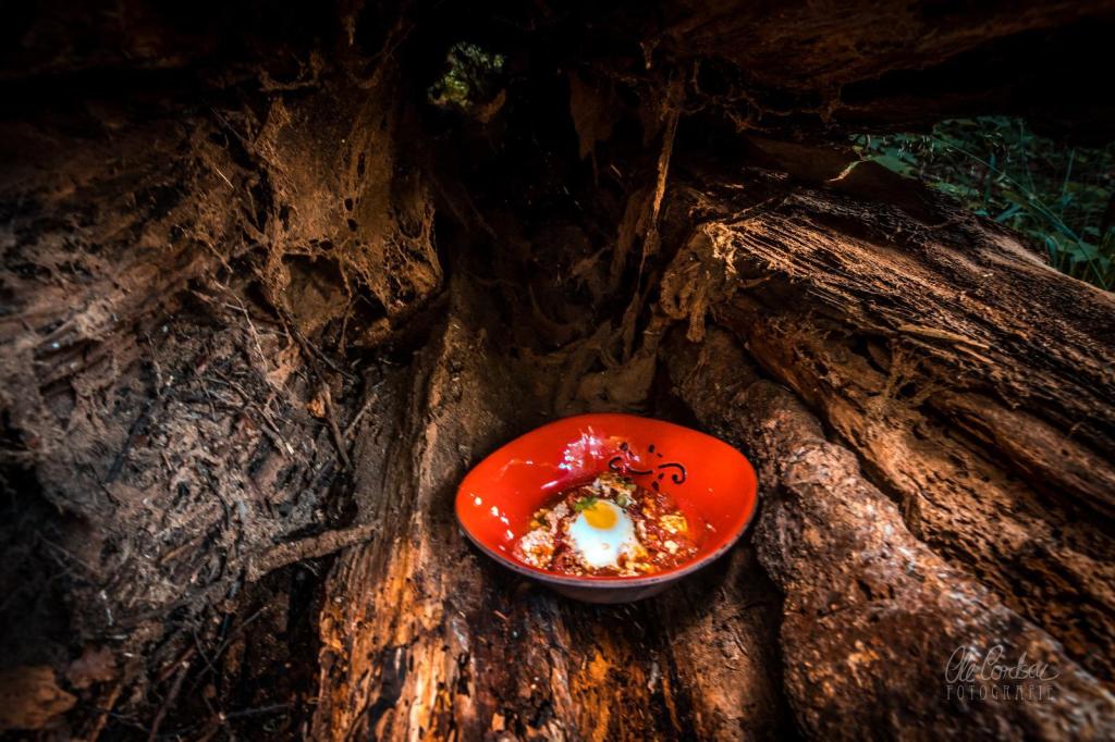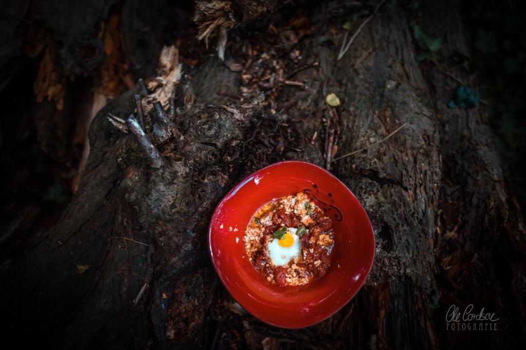 In Südamerika werden verlorene, pochierte Eier in Tomatensauce geneckt von schwarzen Bohnen und gefüllt in frische Tortillas, „Huevos rancheros“ genannt, Bauern-Eier, und waren wohl das karg-köstliche Mahl von Farm-Arbeitern. Auch in der Türkei kennt und liebt man die Kombination von Eiern in brodelnder Tomatensauce (zurecht). Dort unter dem Namen „Menemen“ und eher als tomatiges Rührei. Als „Shakshuka“ hatte er das Gericht kennen und sofort lieben gelernt. Quasi Nationalgericht Israels, auch wenn die Wurzeln in Nordafrika liegen sollen. Wo genau weiß heute niemand mehr, stört aber auch keinen großen Geist. Kennengelernt hatte er es indes nicht in Tel Aviv, Netanja, Jaffa oder Jerusalem, sondern bei Schorsch, der es ihm einst nach durchzechter Nacht zum Frühstück serviert hatte. Die Chilischärfe, gepaart mit starkem Kaffee, hatte seine schwipszerlegten Lebensgeister auf einen Schlag wiederbelebt und seinen Organismus wachgerüttelt. Und genau das, genau solche Wunderkräfte brauchte Wulnikowski auch jetzt. „Vielleicht lassen sich damit sogar Pottwale abschütteln“, murmelte er vor sich hin. Rollte sich aus dem Bett, begann zu schnippeln und schmurgeln für seine Lieblingsvariante, in der in der Tomatenschärfe auch noch cremiger Feta zerschmolz, heizte den Ofen vor, brühte sich Kaffee. Und als alles fertig war, nahm er sich eine Schüssel der heißen Köstlichkeit und schlurfte damit in den Wald, um ganz allein in Einsamkeit, fernab vom Lärm der Stadt und Vollmondtrommler wach zu werden.