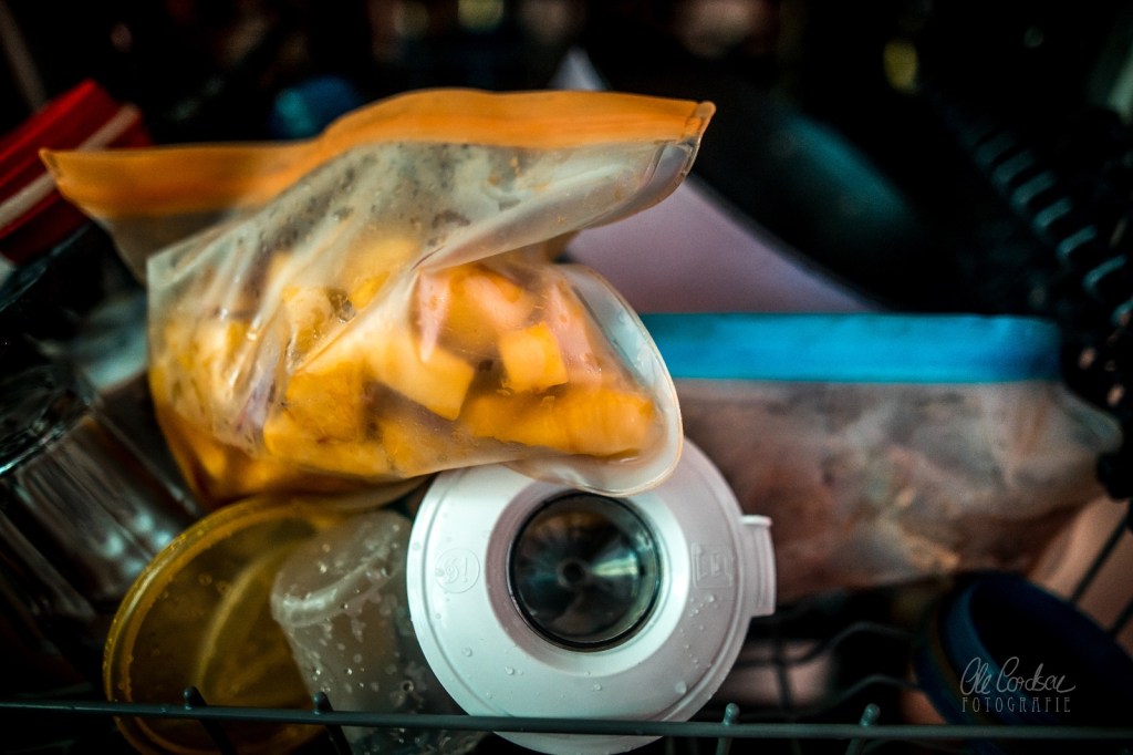 Vor allem aber will ich SEHEN und MITVERFOLGEN, was beim Zubereiten geschieht und keinesfalls einen Beutel mit schlappem Fleisch aus einer Spülmaschine holen. Da werfe ich doch viel lieber mein Sous-vide-Wasserbad an, dessenStromverbrauch relativ gering ist.