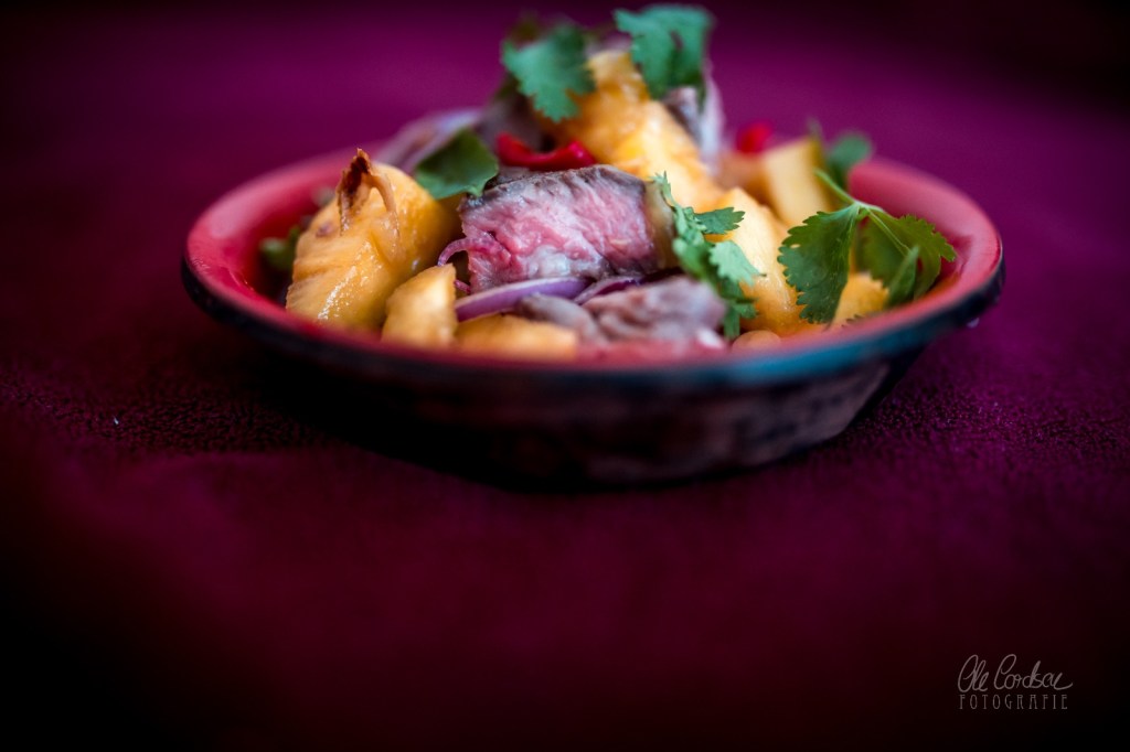 Warum nicht Energie sparen und in der Spülmaschine kochen? Vietnamesischer Ananas-Salat mit zartrosa Steak