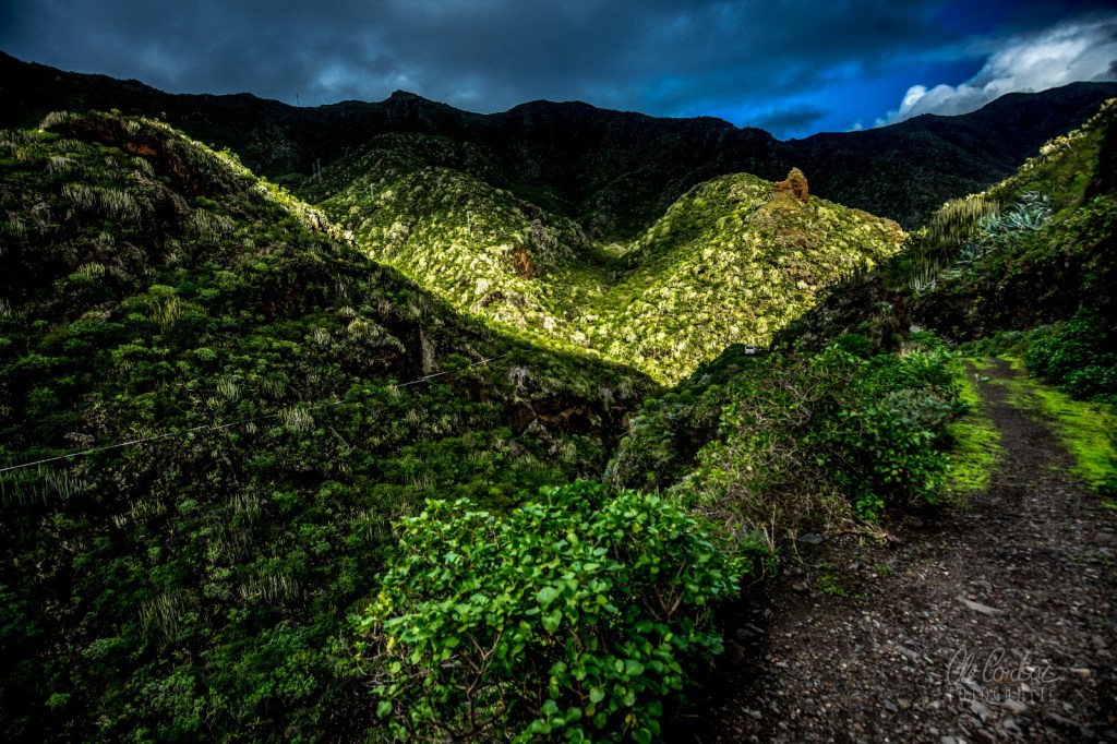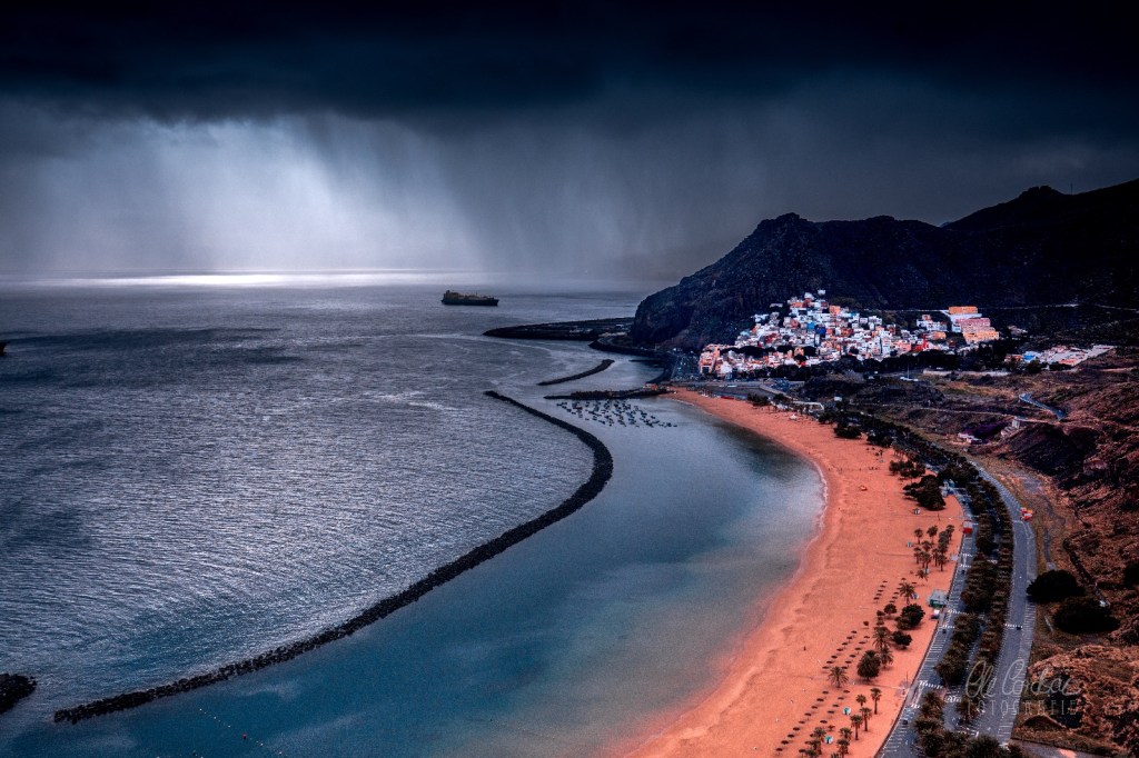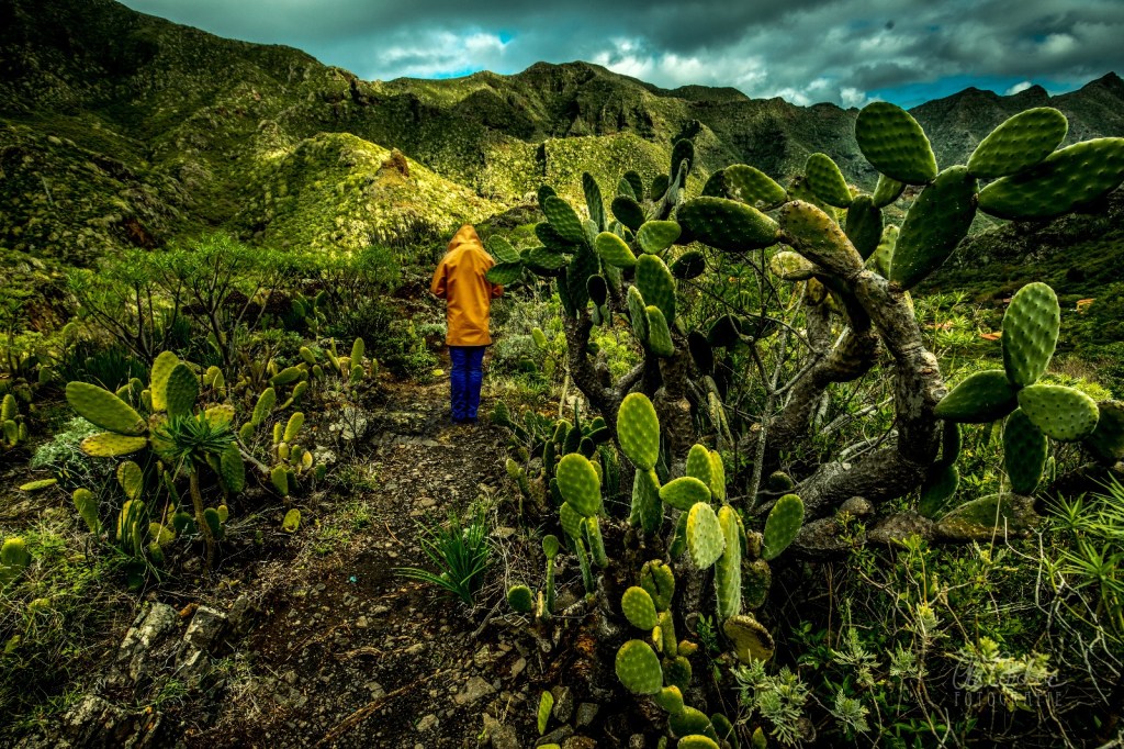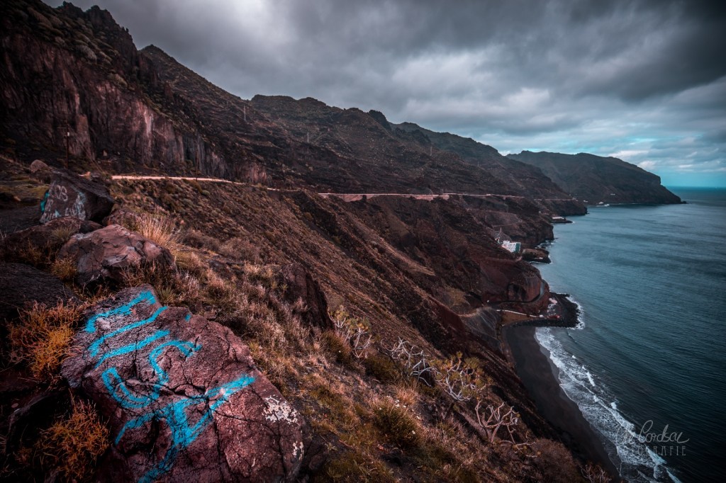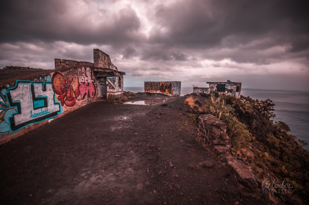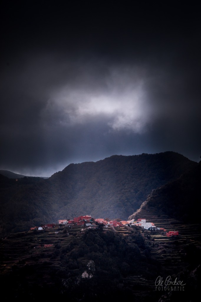 Und dort noch einmal ein Stück die Küste hoch, am wilden Gaviotas-Massiv empor bis hinauf zum Mirador de las Teresitas, einem wilden Aussichtspunkt, wo damals noch Ruinen verlassener Betonbaracken standen, mit Graffiti besprüht, was immer sie einst beherbergt haben mögen. Man hört, sie seien vor Jahren abgerissen worden. Und eben dort erreicht Dich die Tiefe des Gelesenen noch einmal, während der „Pansen des Esels“, der fette Wolkenberg, der an den Berghängen klebt, sich öffnet und diesmal der Himmel weint und sich ausschüttet über San Andrés.