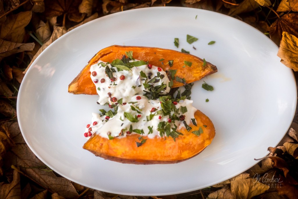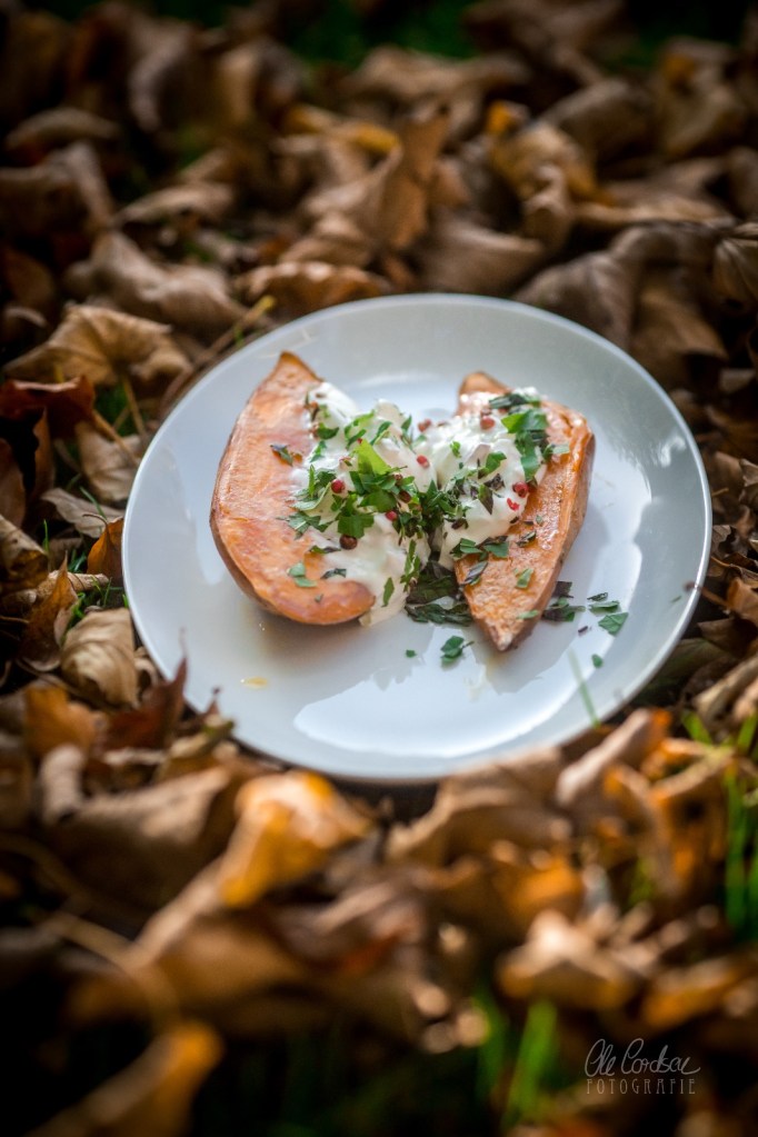Denn meinem kleinen, feinen Lieblingsrestaurant, dem Hotel zur Post in Wiesmoor (unbezahlte Werbung durch Namensnennung), gibt es eine schöne Tradition: den Gruß des Hauses. Bevor die raffiniert geschichteten Gerichte auf den Tisch getragen werden, gibt es ein paar Scheiben selbst gebackenes Brot. Dazu: einen Dip aus Crème fraiche oder Quark, Gurken, Zwiebeln und rotem Pfeffer und feinst geschnippeltem Schnittlauch. Ich habe nie nach dem echten Rezept gefragt, vielmehr wie Tim Mälzer bei „Kitchen impossible“ aber versucht, dem Original nahe zu kommen. Und diesen Dip gibt es hier zu Hause inzwischen fast als Allzweckwaffe, weil er so vieles bereichert, veredelt, dazu schmeckt: Kartoffel-Reibekuchen, Baguettebrot, Gemüse, auch mal ein Stück Fleisch – und eben diesen Dip habe ich jetzt mit den wundertollen Süßkartoffeln gepaart.