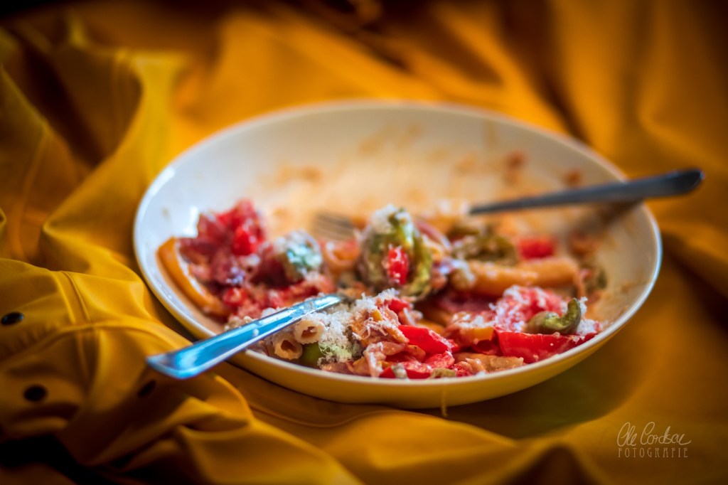 Die Nudeln abseihen und einen Teil des Pastakochwassers auffangen. Das Kochwasser mit der Sauce vermengen, einrühren, abschmecken und schauen, ob noch ein Hauch Salz zusätzlich nötig ist, vielleicht auch Pfeffer, und dann die Pasta in der Sauce baden lassen. Wer mag, Nonna mag immer, trickelt noch ein paar kleine Spritzer Olivenöl drüber. Dann die Petersilienblätter darüber streuen und den restlichen Parmesan und sofort servieren. Im Zweifel sogar direkt auf einer Regenjacke.