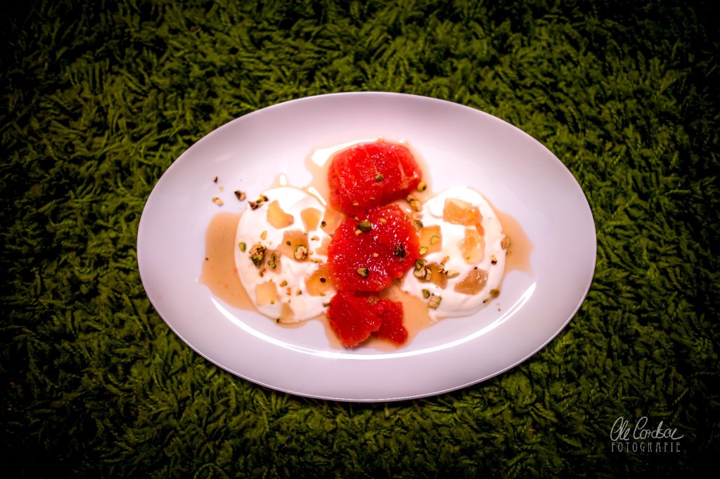 Darauf dürfen dann die Honig-Karamell-Grapefruits sich edel ausstrecken. Zugedeckt mit ein wenig darüber geträufeltem restlichem Karamellhonig. Und als köstliches Schmuck-Ornat hernach noch mit gehackten Pistazienkernen überstreut.