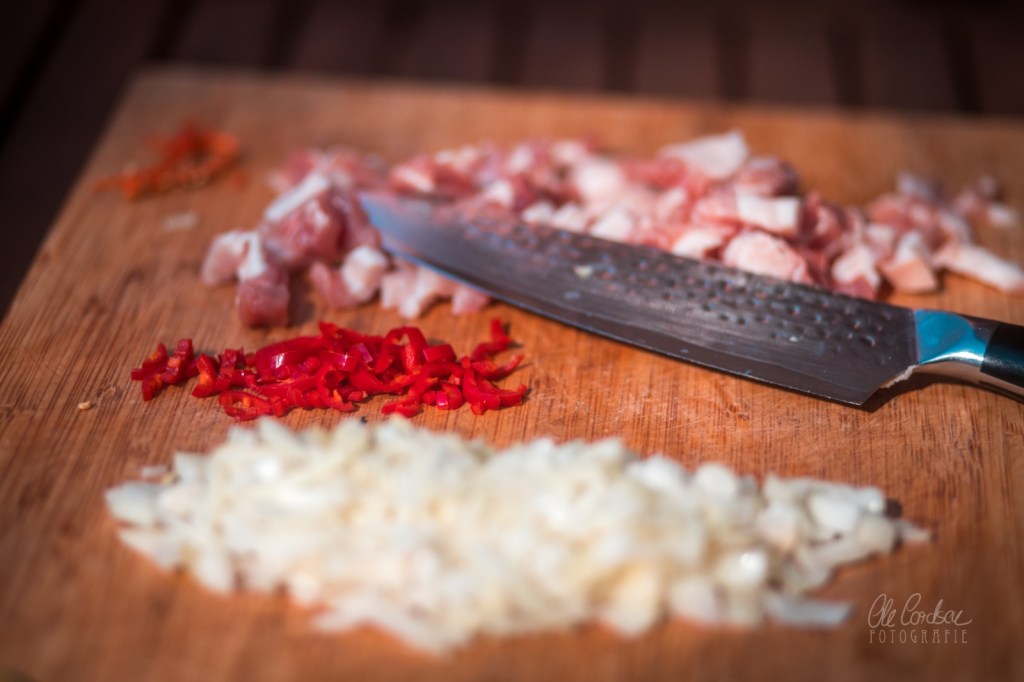60 Gramm Pancetta (alternativ Bauchspeck, ungeräuchert, oder sonst Schinkenwürfel)