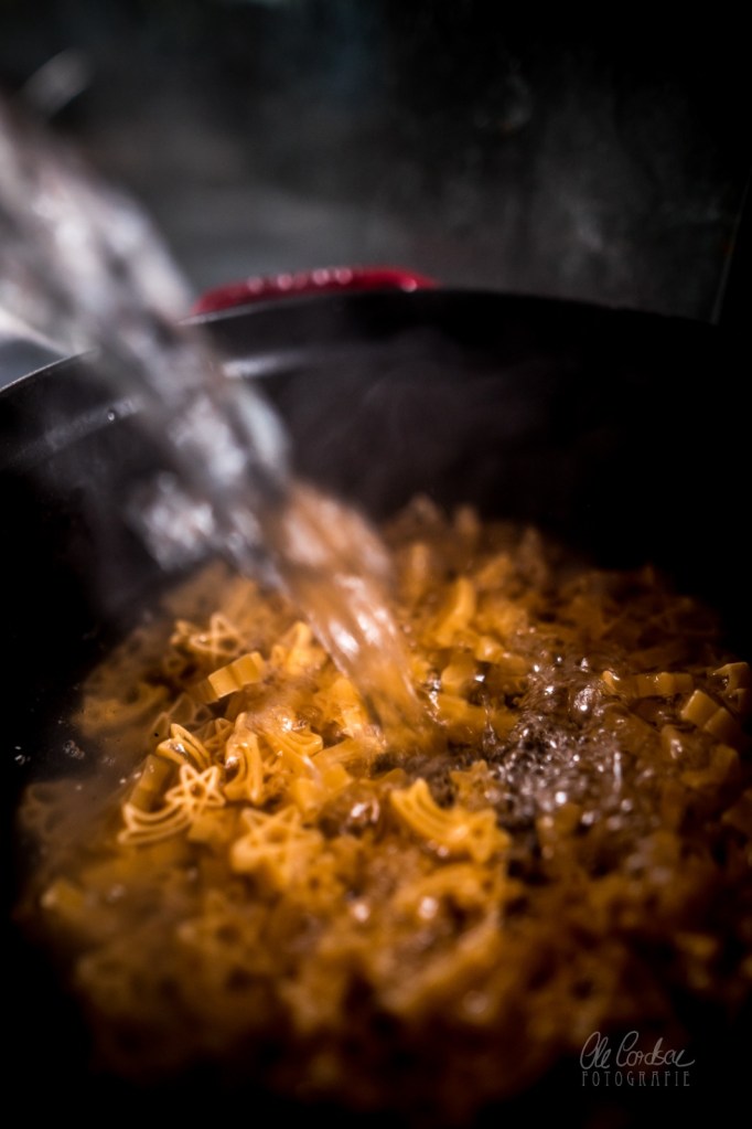 Rechtzeitig vorm Servieren gesalzenes Pastawasser aufstellen (mindestens vier Liter verlangt Artie). Sobald es sprudelt, die Nudeln hineinschütten und dann nach Packungsanleitung „al dente“ garen.