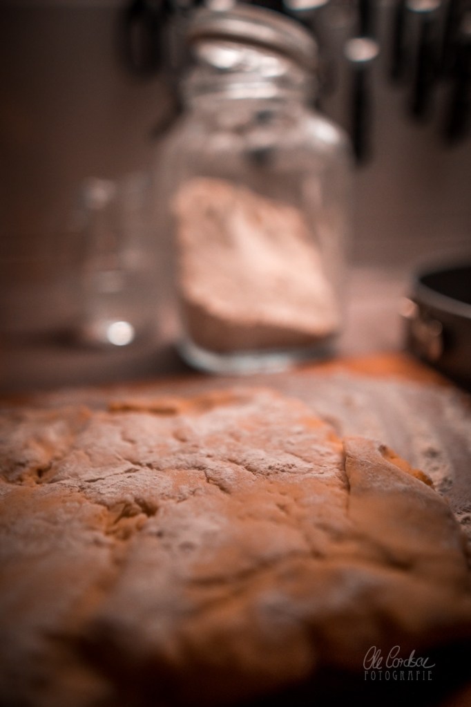 Den Ofen auf 180 Grad Ober/Unterhitze erhitzen (das ist hier wichtig, damit der kalte Teig schön kross und luftig wird).