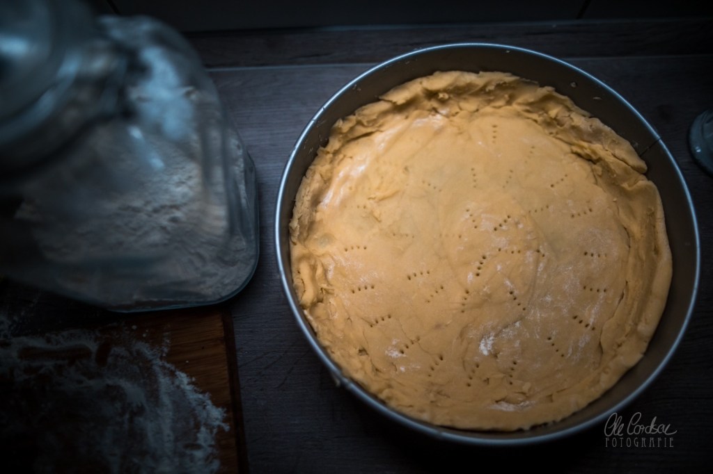 Dann den Teig dünn ausrollen und in eine Springform basteln (bei mir waren es 28 cm, bei 26cm wird der Pie etwas höher, was ihn aber nicht minder köstlich macht). Eventuell mit einem Teigroller glattstreichen. Dann mit einem Stück Backpapier den Kuchenrohling ausschlagen und den Teiginnenraum zwischen den Rändern mit trockenen Hülsenfrüchten zum Blindbacken füllen. Nicht die Hülsenfrüchte direkt auf den Teig geben, es sei denn, Ihr habt Lust, die Teile danach alle wieder aus dem Teig zu friemeln.