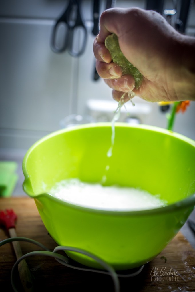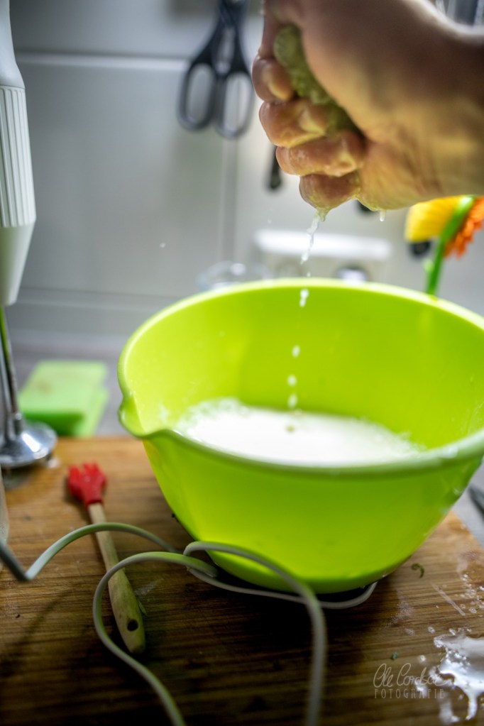 Unterdessen für die Masse zunächst Eier und Zucker samt der Prise Salz schaumig rühren. Dann die Schale von den Limetten und der Zitrone abreiben, die Zitrusfrüchte halbieren und in den Zucker-Ei-Schaum pressen. Die Sahne dazugießen. Nochmal kräftig durchquirlen, möglichst lange, damit, falls Ihr Zesten gerissen habt, statt die Schale abzureißen, die Messer des Pürierstabs das Ganze in kleinere Stückchen fetzen.