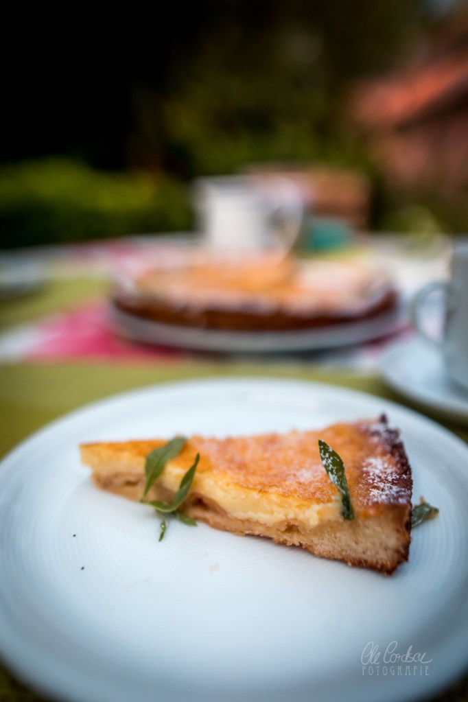Den nunmehr zart angeknusperten Teigrohling rausnehmen und die Ei-Sahne-Zitrusmasse hineingießen – und flugs zurück in den Ofen damit, für etwa weitere 45 Minuten.