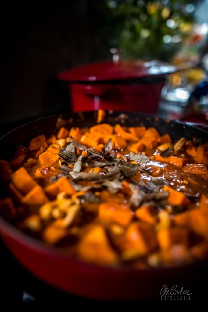 Die Süßkartoffelwürfel und eventuell die Kokosmilch hinzugeben, die Cashewkerne dazuwerfen, ordentlich durchrühren. Die Curryblätter darüberstreuen und einrühren. Den Deckel auflegen und auf niedriger Stufe etwa eine halbe Stunde lang köcheln lassen. Vielleicht zwischendurch mal umrühren.