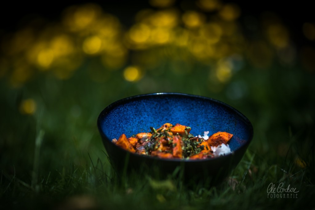 1 Kilo Süßkartoffeln, geschält (wer die Schalen vorher putzt und schrubbt, kann aus den Schalen mit etwas Öl und Salz prima Chips im Ofen machen) und gewürfelt