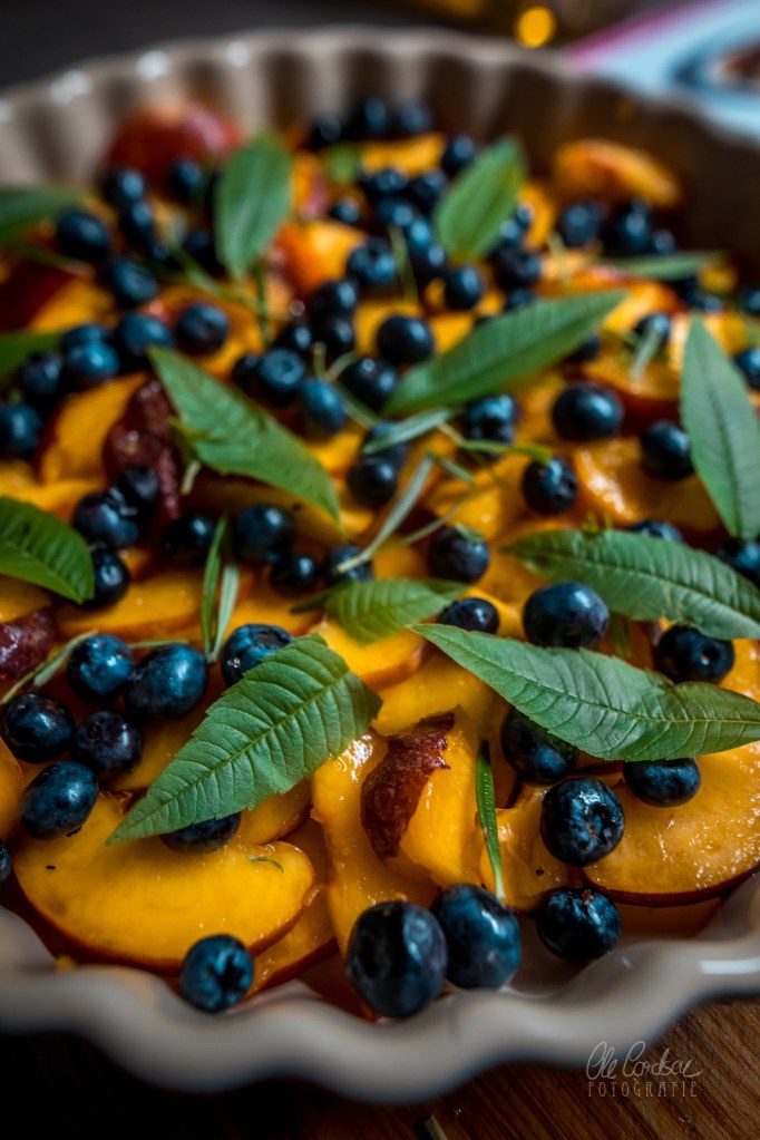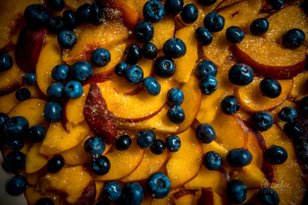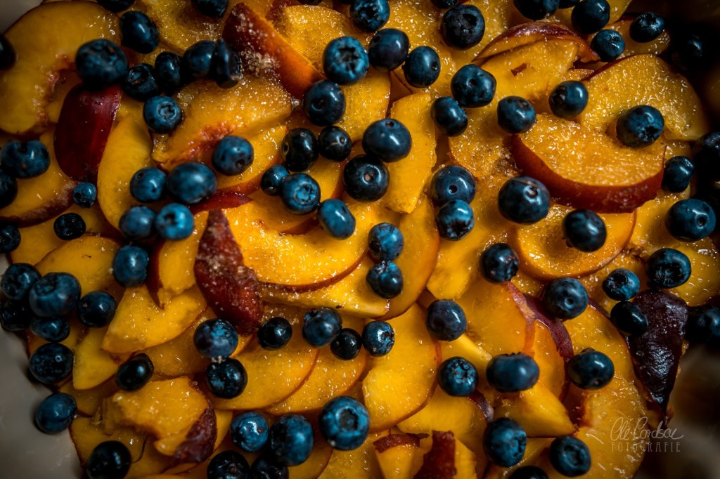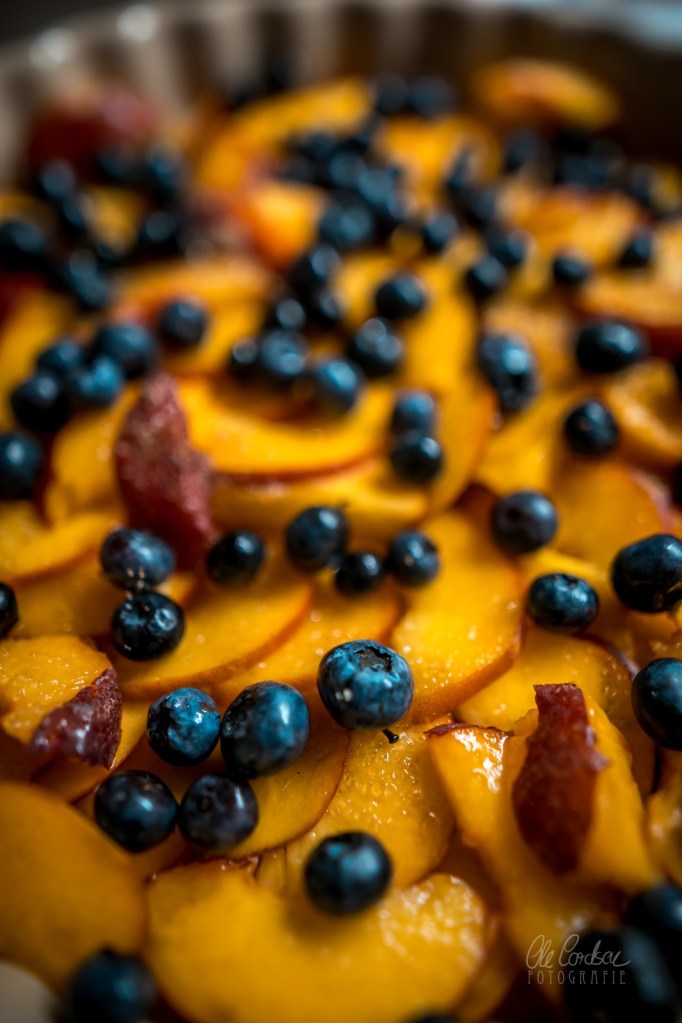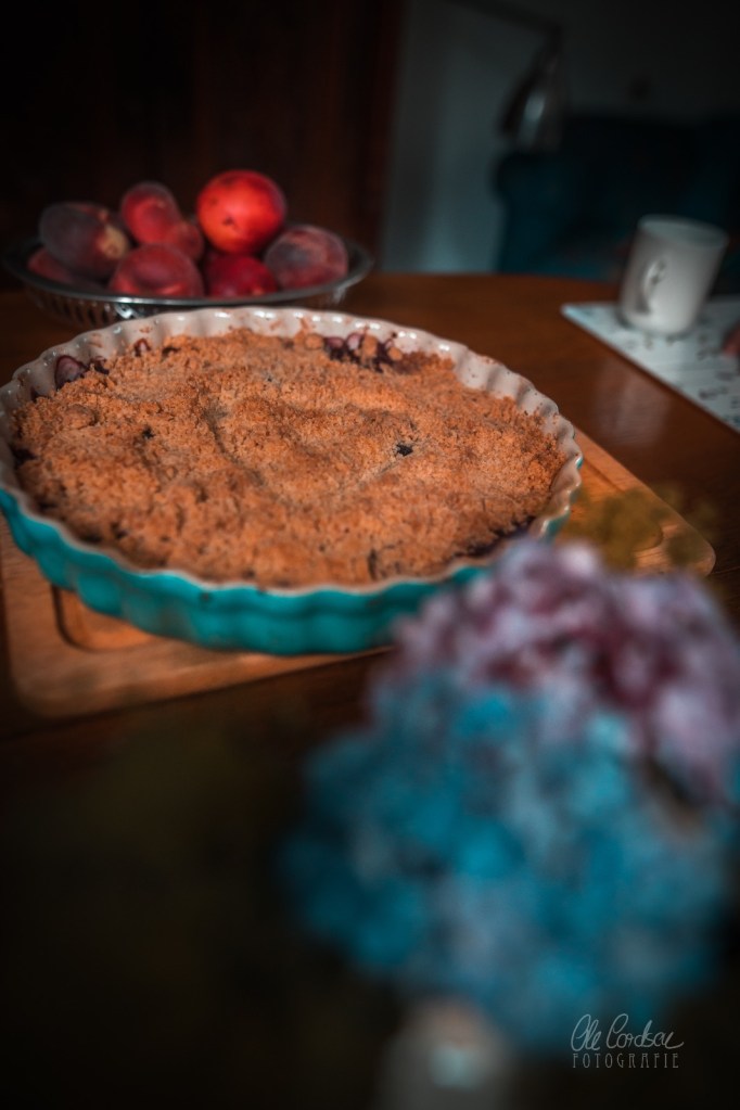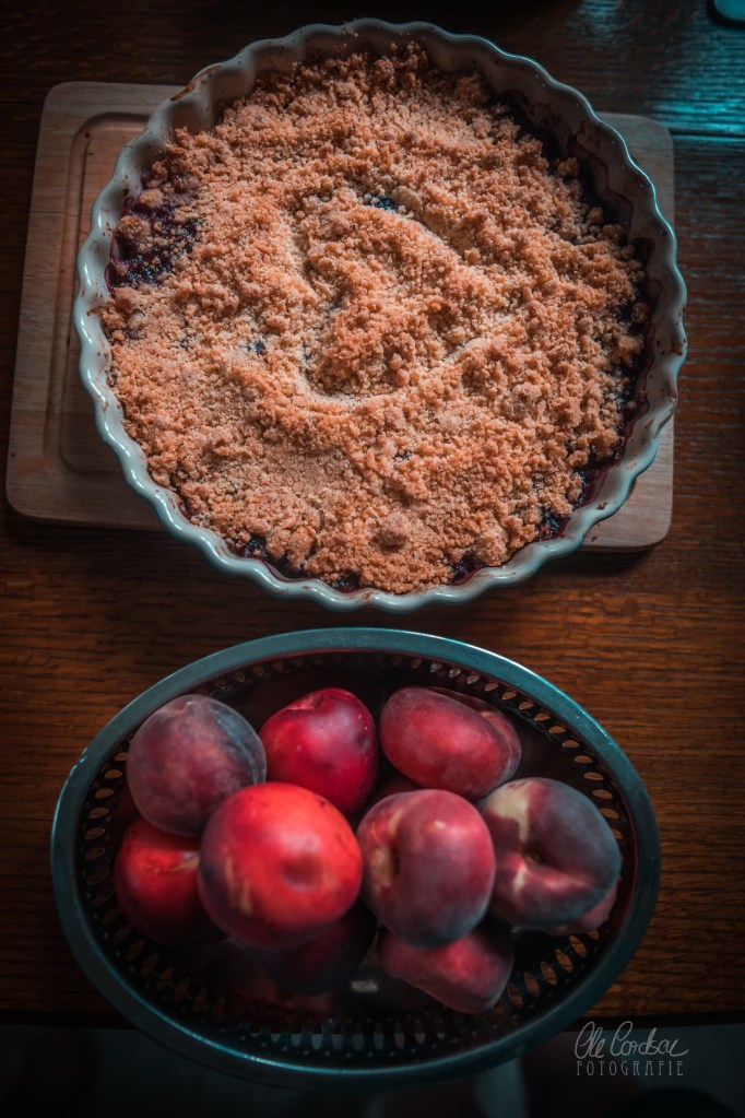 ich glaub ich muss direkt in die Küche Crumble backen….Pfirsiche bzw. Nektarinen hab ich da. Und Blaubeeren.