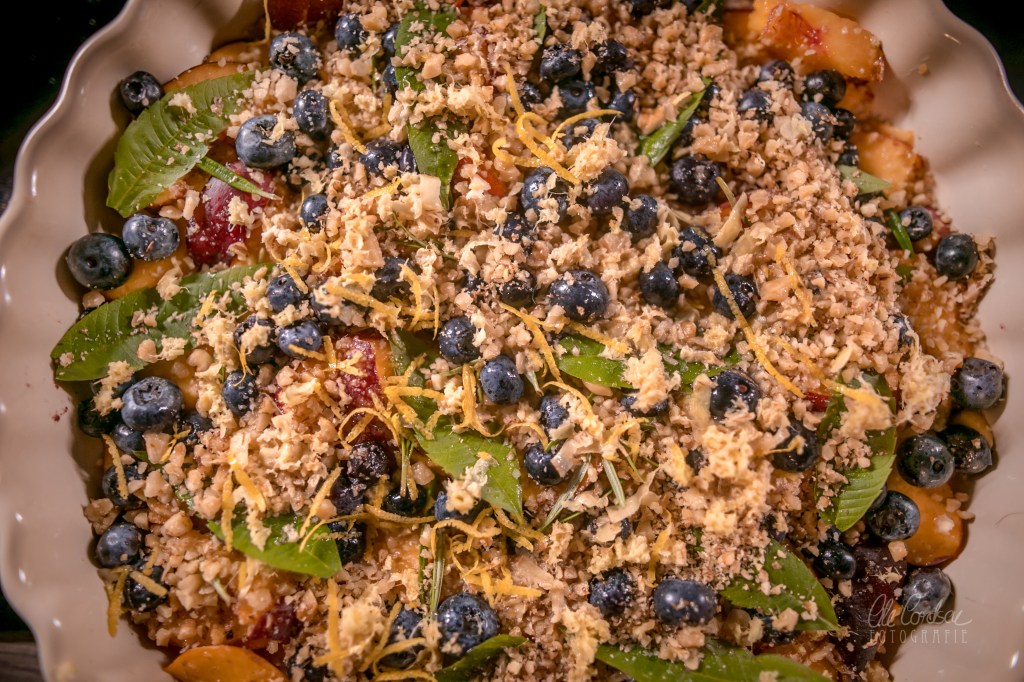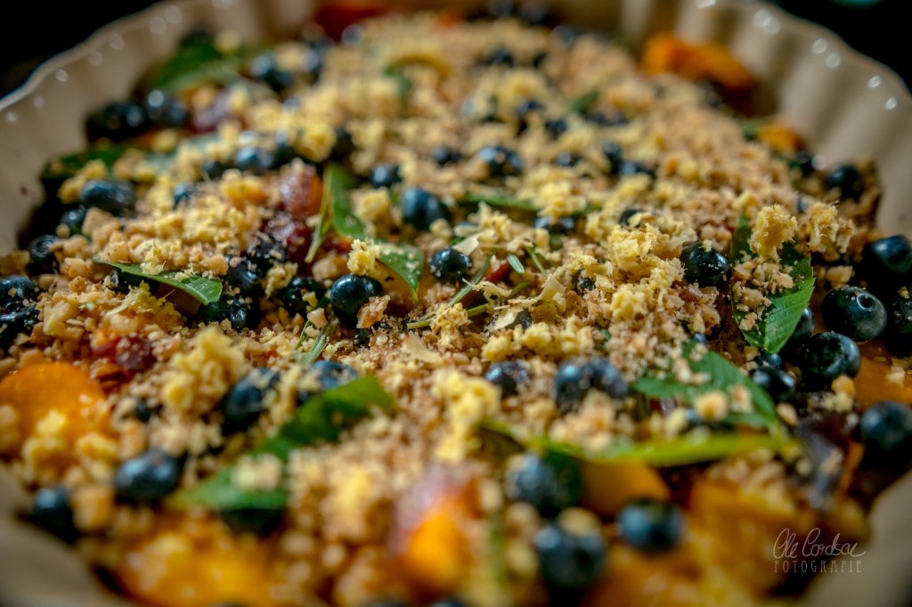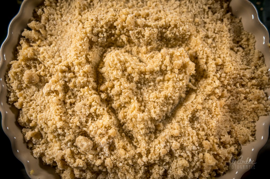 Die Streusel dann auf dem Obst/Kräuter/Walnuss-Miteinander verteilen. Wen spontan der Hafer sticht, oder wer romantisch verklärte Kitsch-Anwandlungen hat, kann auch ein Herz in die Mitte malen mit dem Finger.