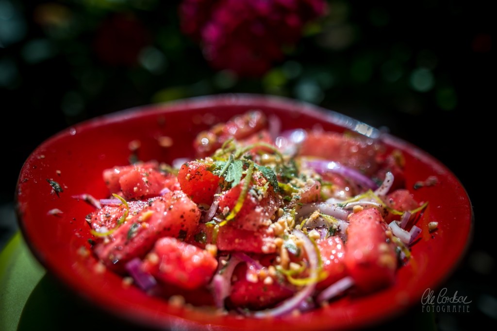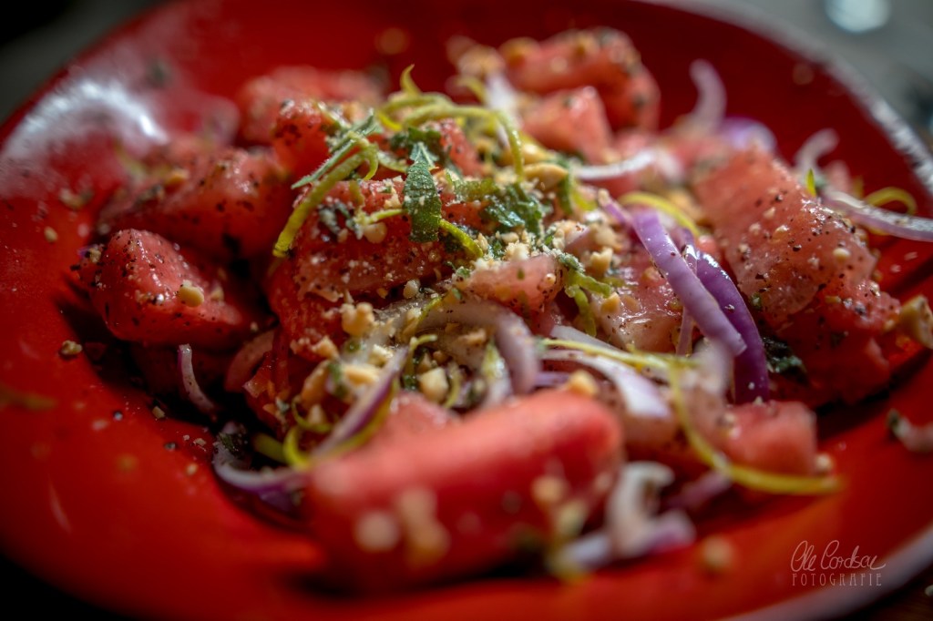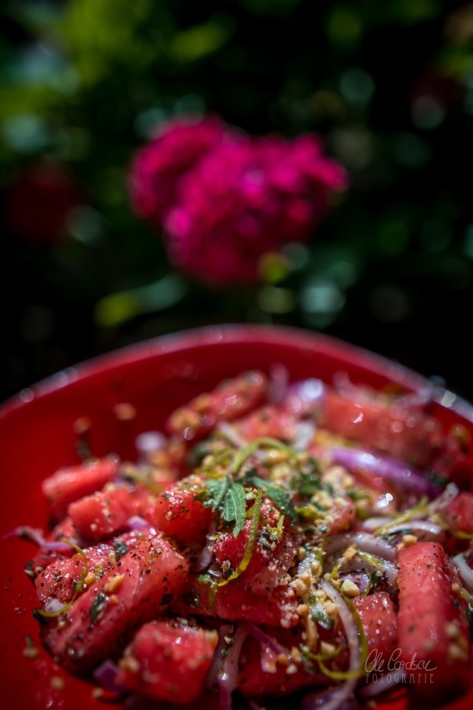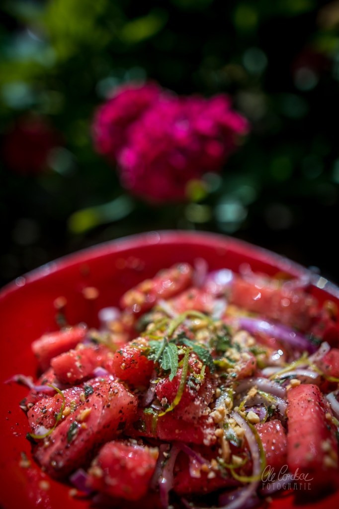 Schietwetter-Trotz, kistenweise: einer meiner liebsten Sommersalate mit Wassermelone, Erdnüssen, Limette, Sumach und Chili