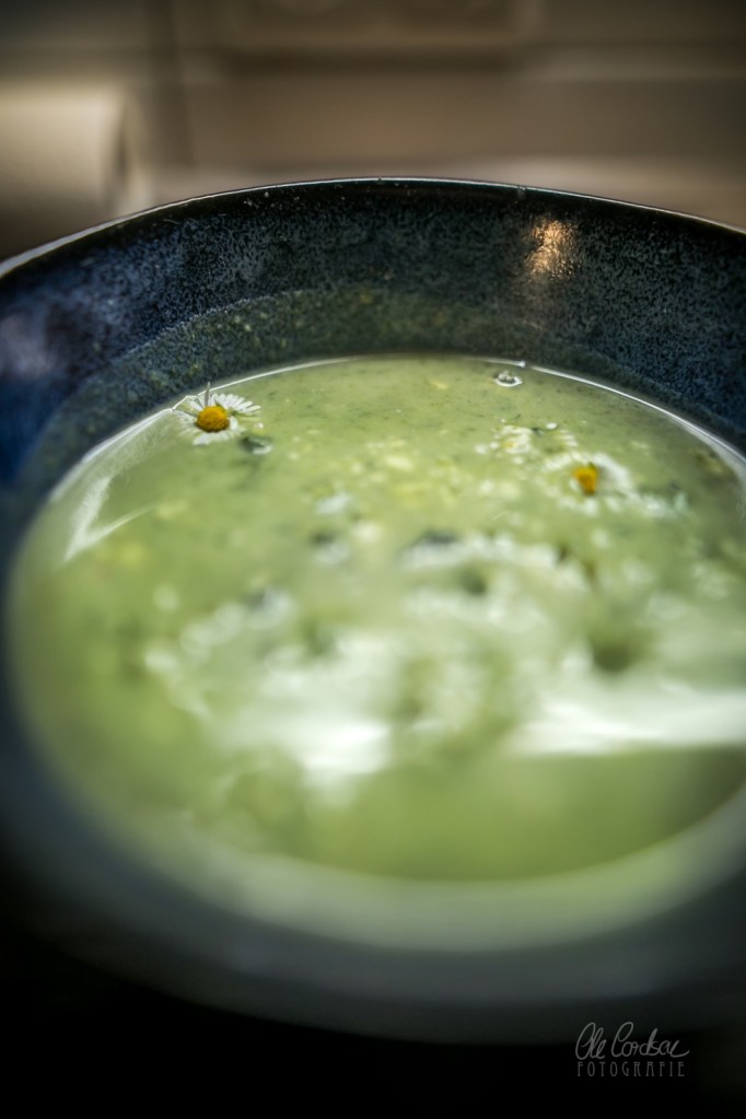 Mein Hirn bejubelt jedenfalls die Begegnung mit dem Vergessenen und Unbekannten, die wundersam wundertollen Aromen der Suppe, die dank Giersch und Gundermann, Bärlauchblättern und -blüten, einem Bisschen Knoblauchrauke, Gänseblümchen und auch zarten Brennesselblätterspitzen eine ganz besondere Würze entfaltet hat. Dank des Gundermanns meint man immer wieder plötzlich Minze oder auch Lakritz zu schmecken. Welch sinnliches Abenteuer.