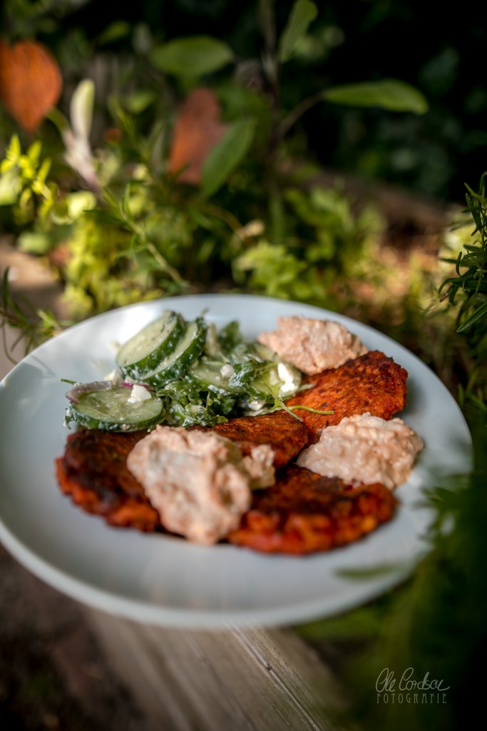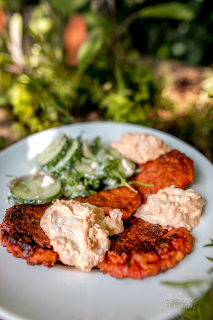 Die Idee mit der Minze finde ich auch klasse. Das ist glaube ich ein perfekter Gegenpol für die würzigen Tomatenpuffer.