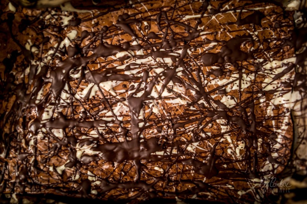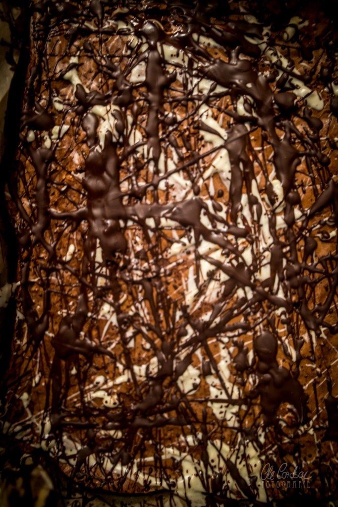 Die Brownies mithilfe des Papiers aus der Form heben. Dann mit einem Löffel beide Schokoladensorten abwechselnd ganz im Jackson-Pollock-Style über den Kuchen träufeln, fegen, fetzen, werfen, spritzen, in absichtlichen oder zufälligen Mustern. Sei wild, sei frei, sei Du und staune, welche Formen und Muster sich plötzlich bilden.