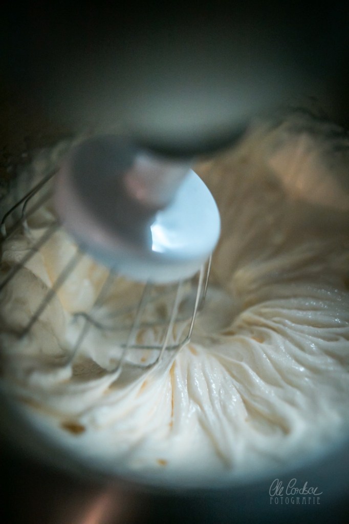 Während die Schokobuttercreme etwas abkühlt, wuchte die Küchenmaschine oder eine Rührschüssel mit Mixer aus dem Schrank, um darin Zucker und Eier schaumig zu schlagen in wilden Rührbesenkreisen und -schlagen, bis das Ganze sich in eine feste luftig-cremige Masse verwandelt hat.