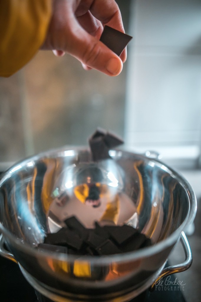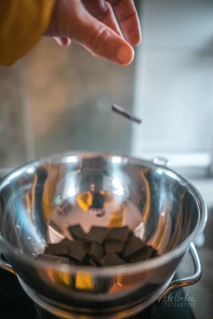 Auch die Butter wird dahinschmelzen im Wasserdampfbad, sich cremig einschmiegen, während Du rührst, und eins werden mit der schokoladigen Masse.