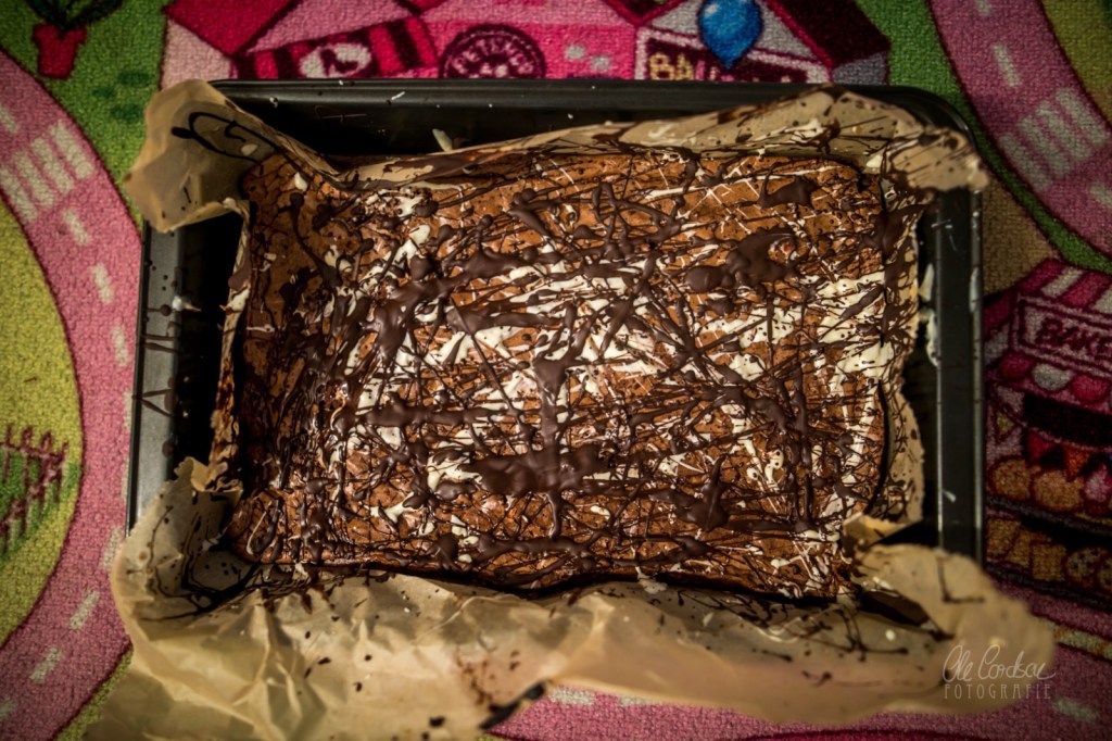 Eine rechteckige oder quadratische Brownie-Backform (20 cm) exaltisch mit Backpapier auslegen. Am besten so, dass das Papier über den Rand hinausragt. Macht weniger Sauerei, wenn man die mächtig leckeren Teile herausholt.