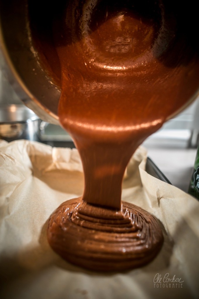 Und Platzmangel: Könntest Du nicht einfach die Brownieform auf einem Tisch in einem Nebenzimmer drapieren und da – vielleicht etwas vorsichtig, um nicht renovieren zu müssen, tropfen und klecksen?