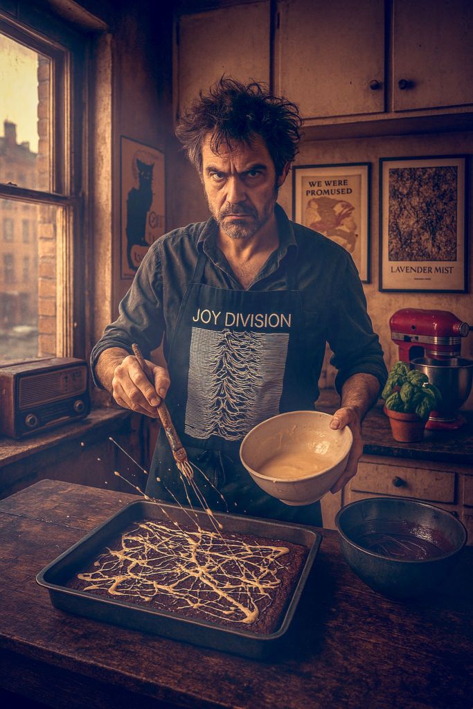 „Was zur Hölle, Wulni?“, entfuhr es ihr, als er die Tür öffnete, in einer Joy-Division-Schürze (sowas gibt’s?), komplett übersprenkelt. Zwei Schüsseln in den Händen, in beiden cremige Flüssigkeiten, eine dunkel wie die Tiefsee, die andere hell wie der Schaum über den Wellen. „Warum schreist Du rum? Ist was passiert? Streichst Du Deine Wand?“ Sie besah seine wilden Spritzer. „Und wenn ja, willst Du Dir nicht lieber nen Maler kommen lassen?“