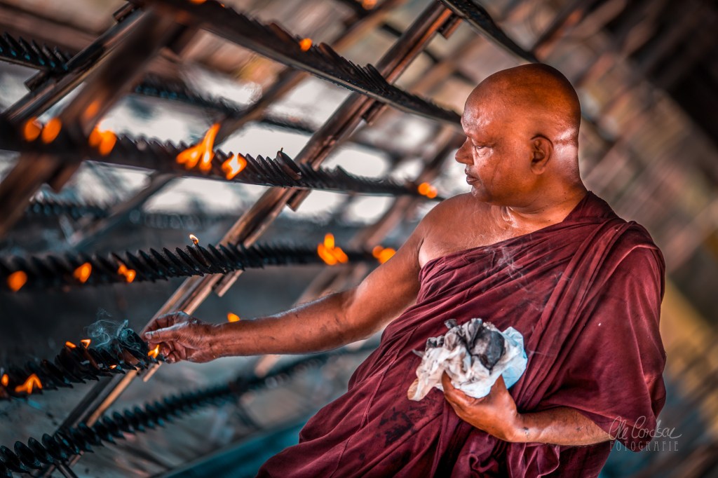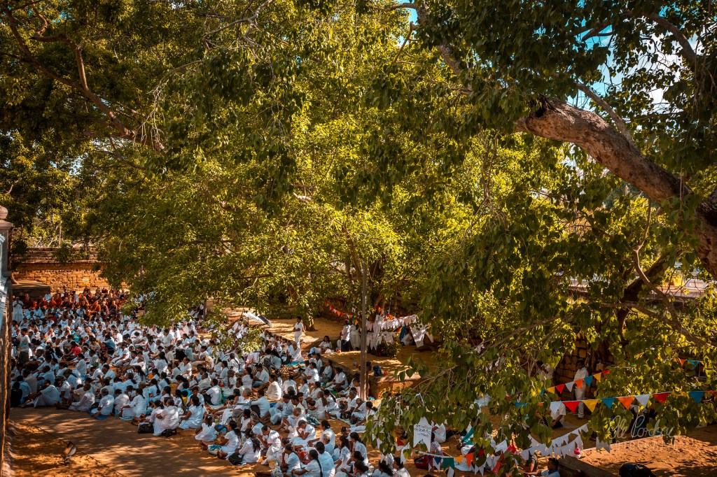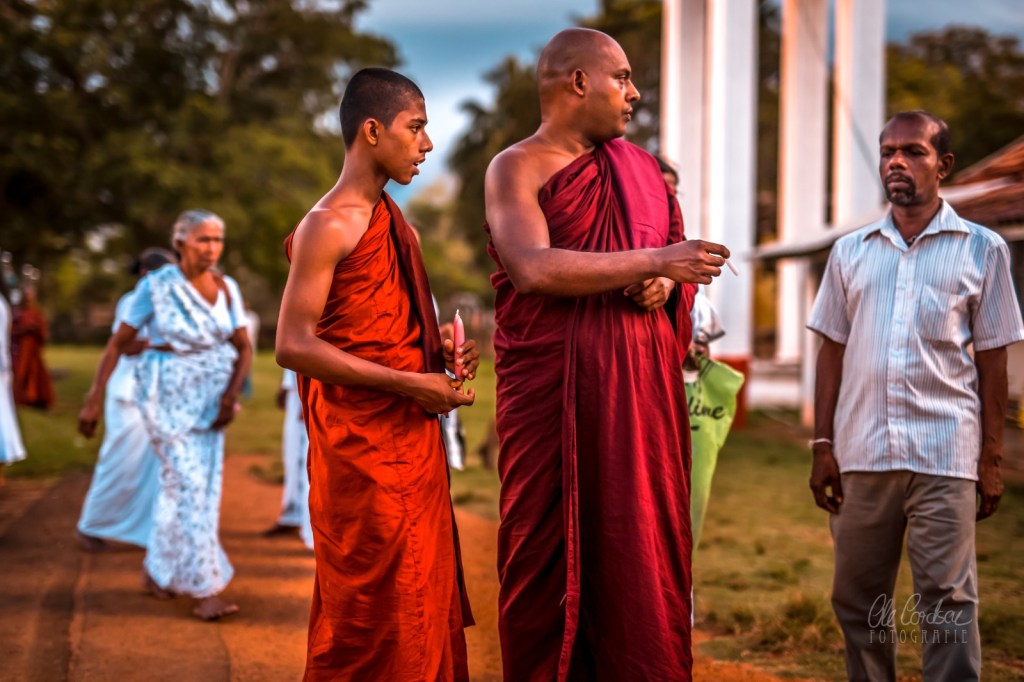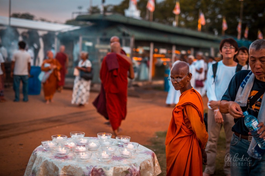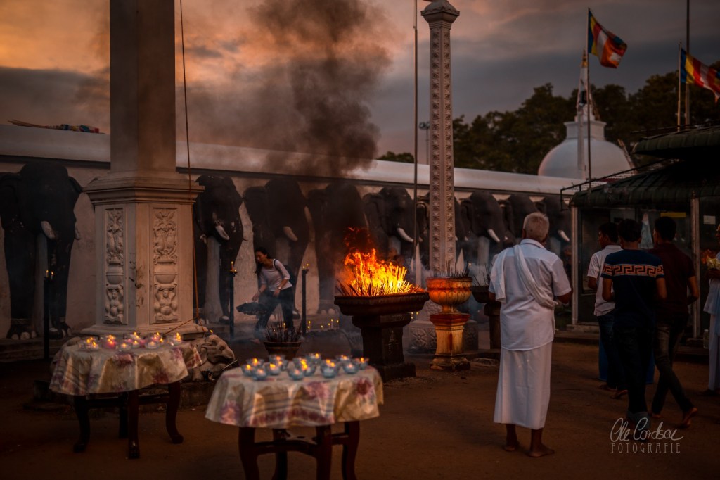 Inmitten loser Wälder, in denen Würgefeigen, Banyan- und Trompetenbäume sprießen, verteilen sich die buddhistischen Heiligtümer, dort, wo kurz nach Christi Geburt die neuntgrößte Stadt der Welt gewesen sein soll und mehr als 1000 Jahre lang Thronsitz singhalesischer Königsdynastien war, ehe die eigentliche Stadt im Jahr 993 nach Christus von geplündert und zerstört wurde und der Dschungel die Paläste und religiösen Bauten lange Jahrhunderte überwucherte und verschluckte. Ein unwirklicher Ort, friedlich geflutet von gläubigen Buddhisten, die zu den Stupas oder Dagobas pilgern. Räucherstäbchen brennen zu den Füßen, Kerzen flackern, buddhistische Mönche schreiten erhaben. Und Hundertschaften setzen sich etwas weiter andächtig betend zu Füßen des majestätischen Bodhi-Baums. Der Überlieferung nach wuchs diese Pappelfeige aus einem Zweig jenes Baumes in Bodhgaya in Nordindien, unter dem Siddharta Gautama, Buddha, die Erleuchtung erlangt haben soll. Vor den palastartigen hohen Mauern, die ihn einrahmen, waschen Menschen Kleider im benachbarten See. An Verkaufsständen davor ballen sich pralle Flipstüten.