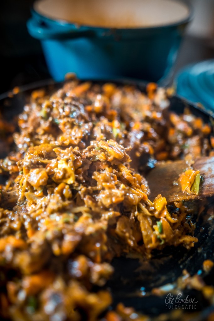 - Dann – oder bei frischen Curryblättern: wenn sie hellgrün geworden sind – das Rindfleisch, Zitronengras, Zimt, Salz und das Currypulver hinzu. Alles unter gelegentlichem Rühren anbraten und zwischendurch größere Hackklumpen mit dem Messer zerlegen, bis das Gehackte anfängt zu bräunen und die Röstaromen (Maillard-Reaktion ahoi) duften. Das Ganze einfach mit dem Wasser bedecken, Hitze auf ein niedriges Köcheln verringern und bei leicht geöffnetem Deckel 35 Minuten lang kochen. Die Kokosmilch hinzugeben, nochmal zum Köcheln bringen, vom Herd nehmen. Für das Kothu Roti beiseite stellen.