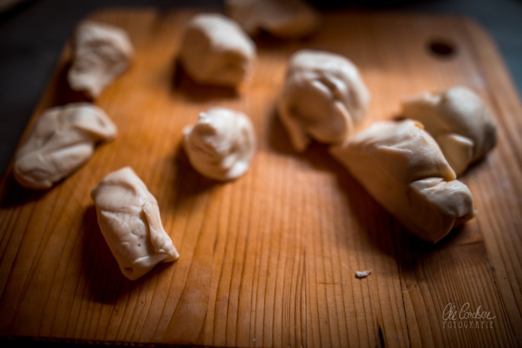 - Den Teig in etwa zwölf gleich große Stücke teilen – und in einer Schüssel mit Deckel oder einem feuchten Trockentuch darübergelegt aufbewahren, aus der man in der Folge immer nur einzelne Stücke entnimmt (oder enorm schnell arbeitet), weil sie sonst auszutrocknen drohen. Alternativ kann man sie allerdings auch unter Frischhaltefolie aufbewahren (ökologisch fragwürdig) oder dünn mit Öl bestreichen, wenn man langsamer arbeitet und sie gegen’s Austrocknen schützen möchte.