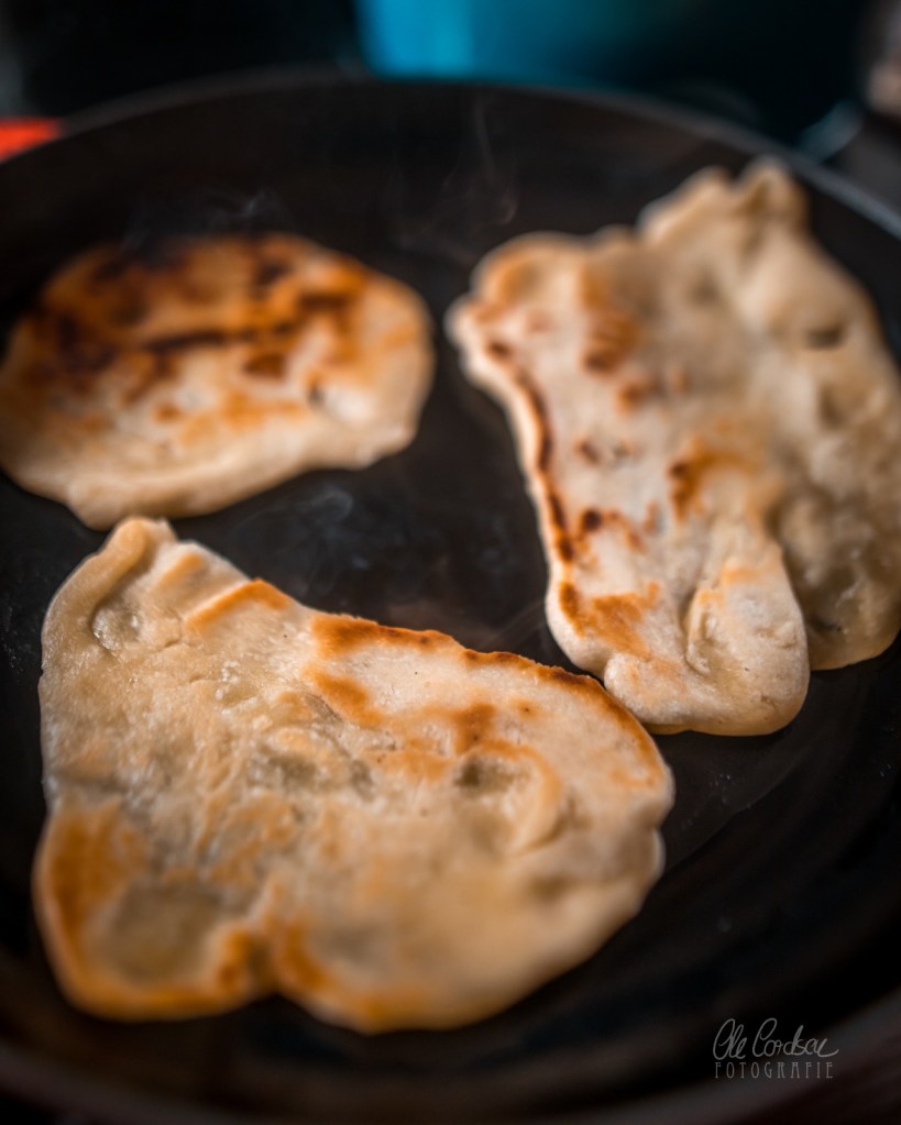- Eine gut geölte flache Grillplatte (so Ihr Grillfans seid und sowas haben solltet) oder eine ebenso gut geölte schwere Bratpfanne (wie bei mir) bei mittlerer Stufe erhitzen. Die dünnen Teigfladen dann etwa 30 Sekunden lang anbraten, bis es anfängt zu blubbern. Dann wenden und eine Minute lang auf der anderen Seite braten, bis der Fladen außen knusprig und goldbraun ist, mit braunen Flecken. Bevorzugt in ein sauberes Geschirrtuch wickeln, um es warm zu halten. Während des Brotbackbratens die nächsten Kugeln platt und breit rollen, dehnen undsoweiter wie beim ersten.