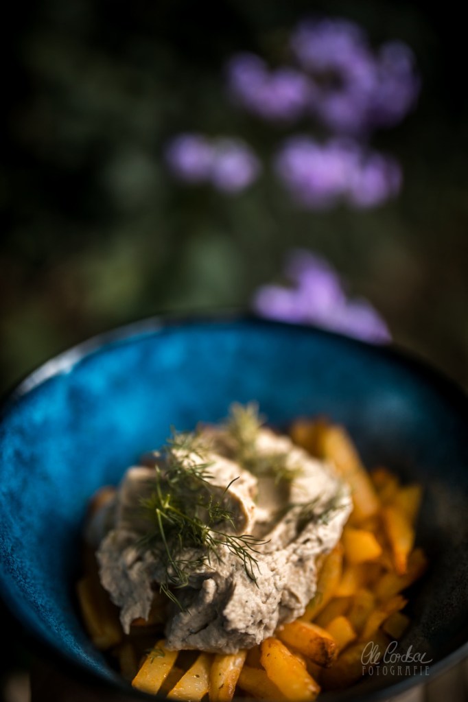 Die knusprigen Pommes herausnehmen und mit etwas Salz und vielleicht auch einer Prise Pul Biber oder Paprikapulver würzen. Einen kräftigen Klecks Mutabbal darauf geben und vielleicht ein paar übrig gelassene Kräuterchen wie Dill oder Petersilie. Oder dendiedas Mutabbal klassisch auf einem Teller anrichten und die Pommes einstippen.