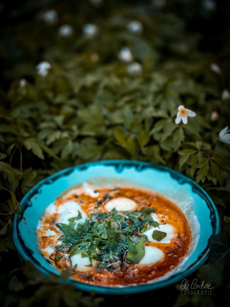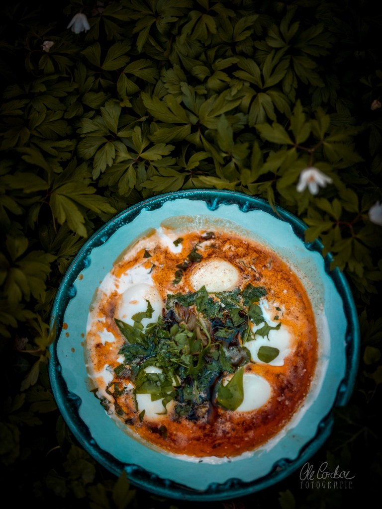Seit Kurzem weht wieder Knoblauchduft durch den Wald – diesmal nicht aus dem Rachen von Mohamed: Bärlauch breitet sich dort als Frühlingsteppich aus. Wer das Kraut mal nicht in Bärlauch-Butter oder Bärlauch-Pesto verwandeln will: besonders köstlich finde ich ihn im Zitrus-Joghurt des türkischen Frühstücksklassikers Çilbir. In dem landen zudem, passend zu Ostern: Eier.