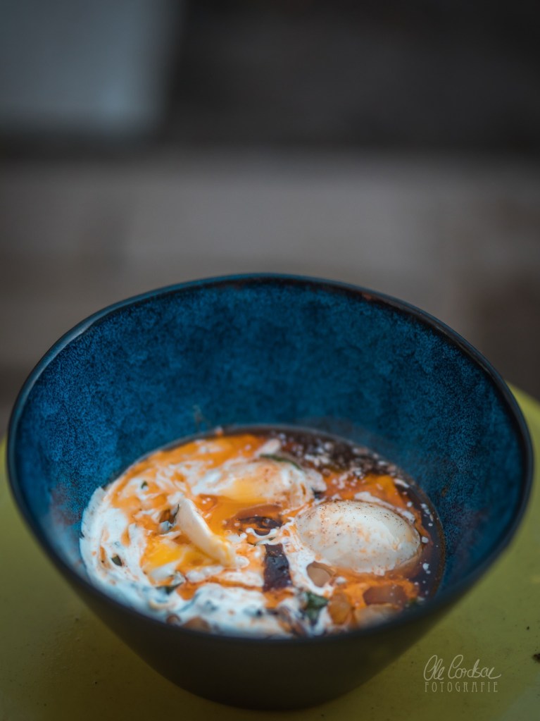 Zwiebeln, im Ofen erhitzt, bis sie karamellisieren und dunkle Röstaromen sich um die Süße schmiegen, legen sich ins gemachte Joghurtbett, dessen zitrusfrische Säure und neckisches Beißen des Knoblauchs die rauchige Süße kontern. Daraus erheben sich Eier, unpolitisch, in einer wobbeligen Sphäre zwischen flüssig und fest, jeder Schuldfrage gegenüber gleichgültig, zischend übergossen mit schäumender Butter, in der Pul-Biber-Flocken tanzen. Seelenfutter, das trösten kann. Eigentlich.