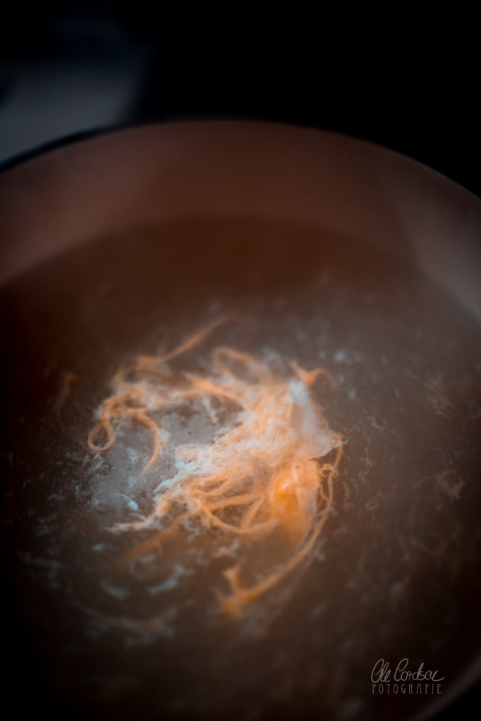 Jetzt kommt der Schneebesen zum Einsatz. Damit Kreise im Wasser ziehen, bis sich ein kleiner Strudel bildet. „Das Ei in die Mitte des Strudels geben, damit das Eiweiß sofort das Eigelb umschließt, und drei Minuten pochieren“, rät Elif Oskan. Aber Achtung! Den Schneebesen unbedingt vorher rausziehen! Sonst zerschlagt Ihr das zu pochierende, anfangs noch extrem fragile Gebilde und bekommt genau den Fadensalat.