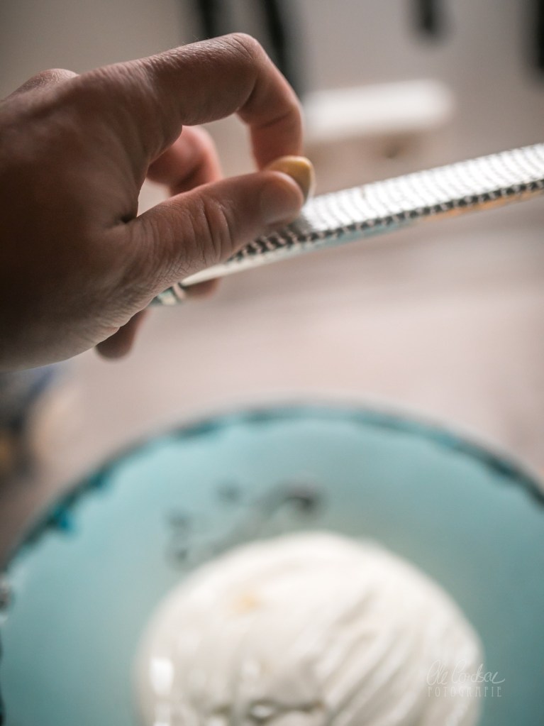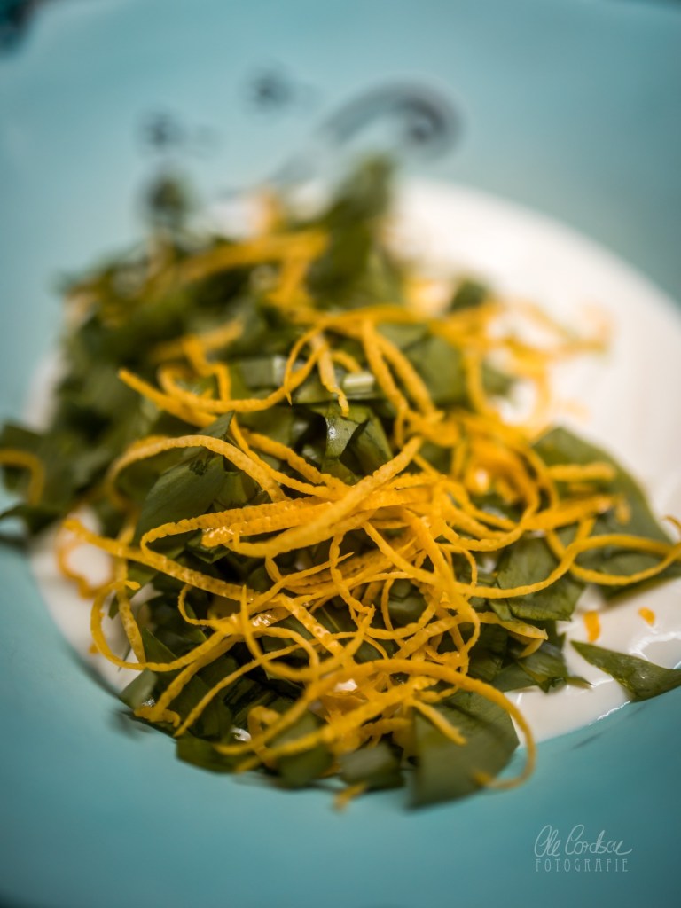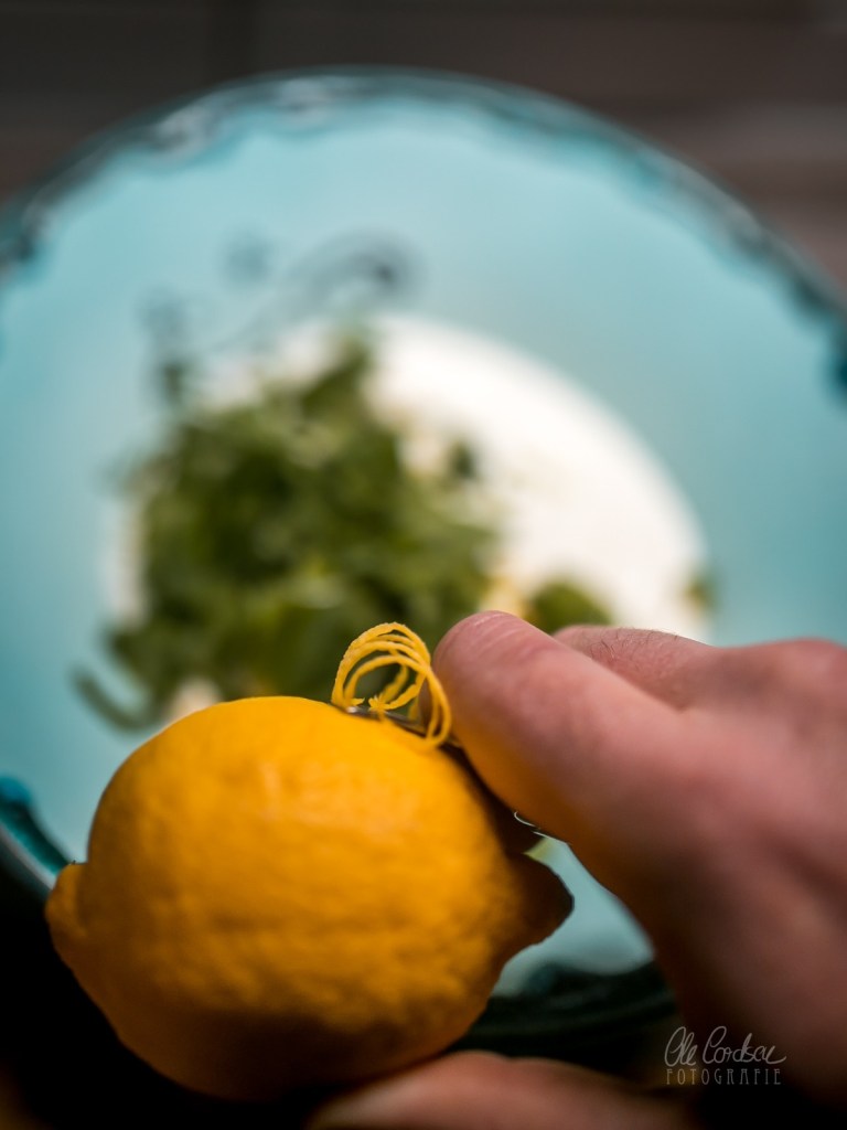 Den Joghurt in eine Schale geben, den Bärlauch und die Zitronenzesten einrühren, den Knoblauch hinzupressen (Elif Oskan sagt „mit einer Microplane in die Schüssel reiben, statt mit einer Presse zerdrücken“, ich halte das im Ergebnis für übertrieben und gefährlicher für die Haut am Daumen).