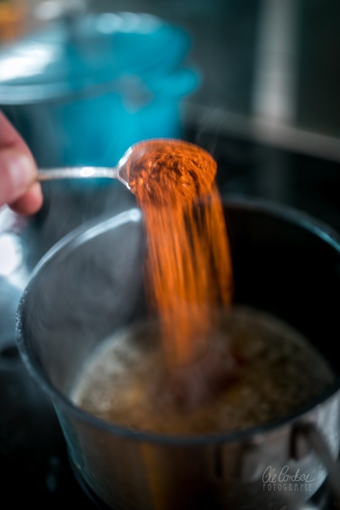 Wer keine Flocken in der Butter und ebenso wenig Molke in der Butter möchte, gießt sie durch ein Passiertuch in einem Sieb ab. Das spielt aber insbesondere auch für die Haltbarkeit eine Rolle, indem der abgekühlte Butterschmalz länger haltbar ist. In meiner Variante ist es so viel Pul-Biber-Butter, wie es fürs Rezept braucht. Da kann man auch die Abkürzung nehmen, Passiertücher schonen, Schritte reduzieren.